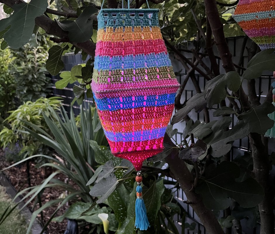 Diese Anleitung erklärt Schritt für Schritt mit Text und vielen Detailbildern das Herstellen von gehäkelten eckig geformten Laternen/Lampions im kunterbunten Boho-Stil mit typischer Quaste.
