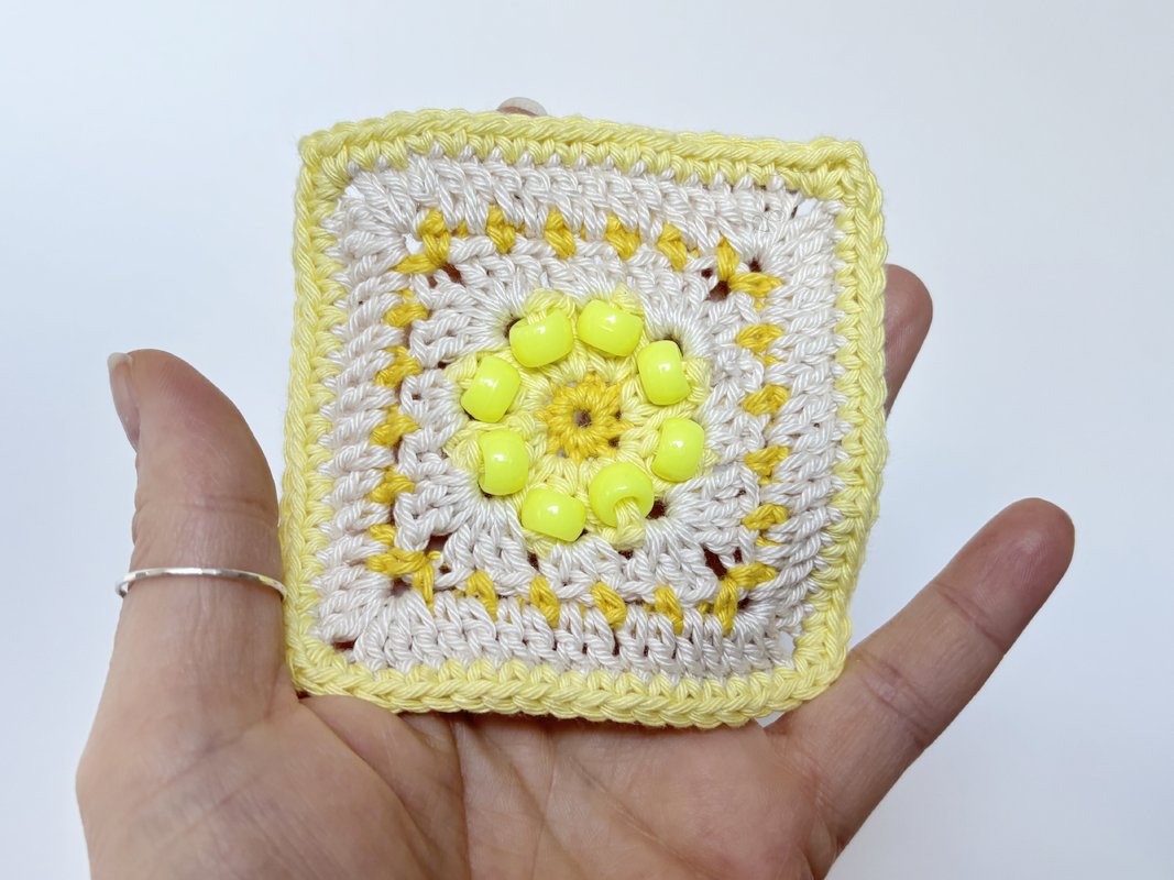Häkle dein eigenes Highlight: Das „Strahlende Sonne“ Granny Square mit eingehäkelten Perlen - Häkelanleitung in deutsch und englisch – Dein modernes Häkelquadrat für strukturierte Projekte!