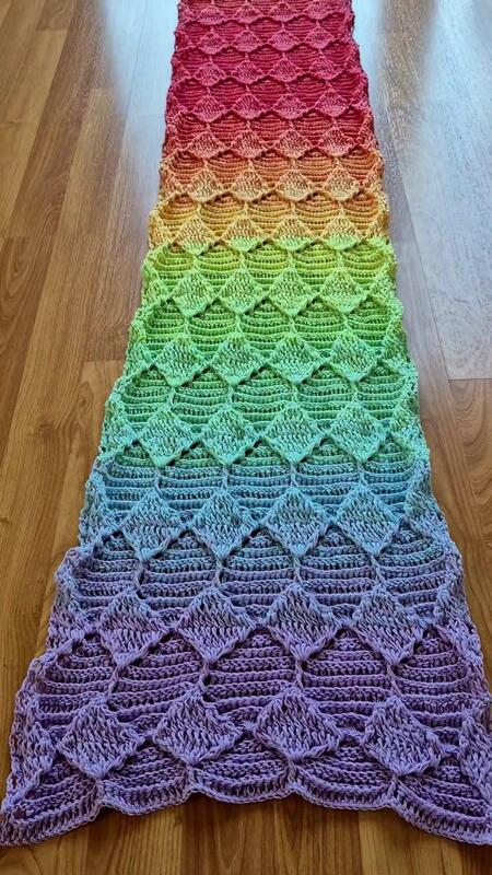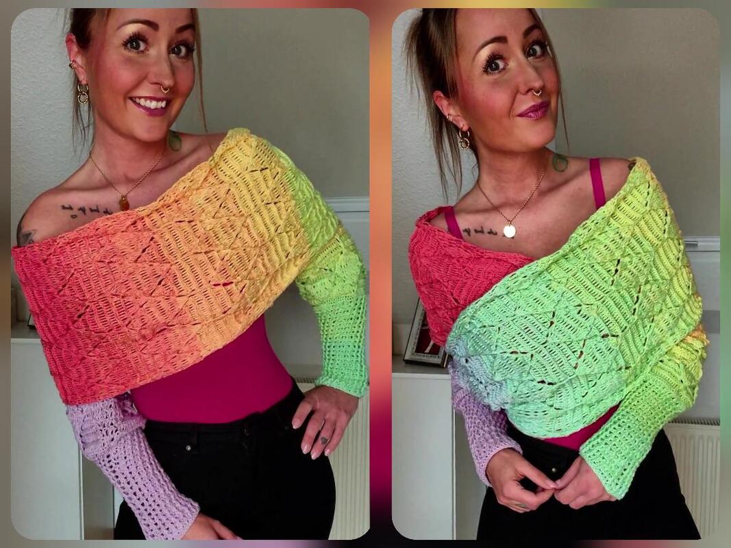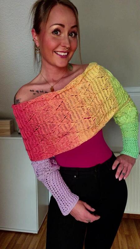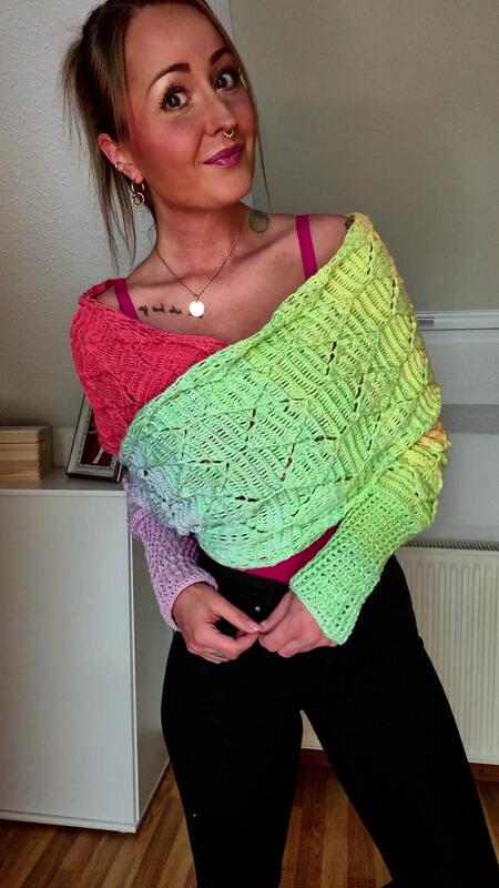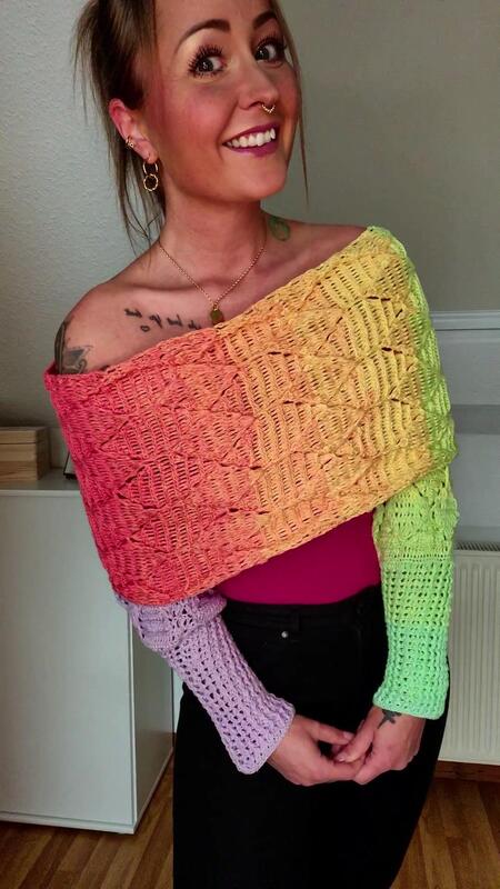 Der Ärmelschal Hilde wird an einem Stück gehäkelt, und ist daher perfekt für Farbverlaufsgarn geeignet.