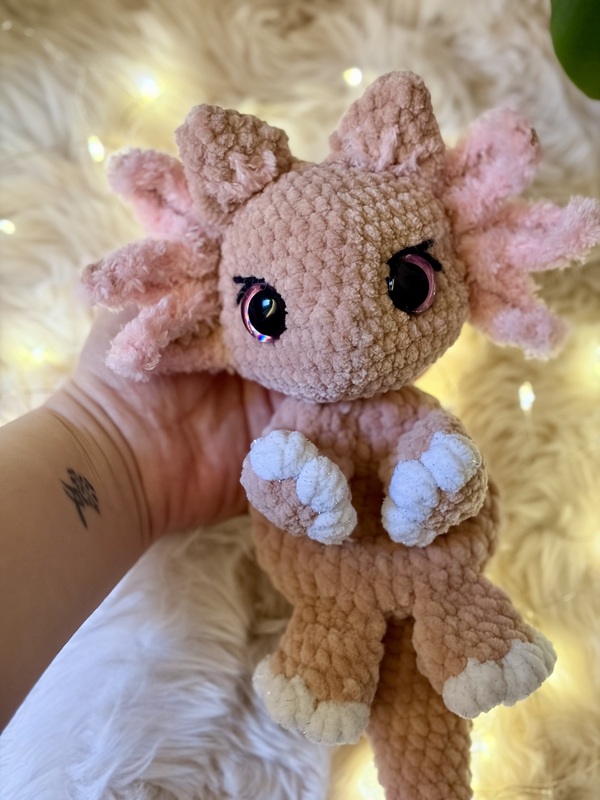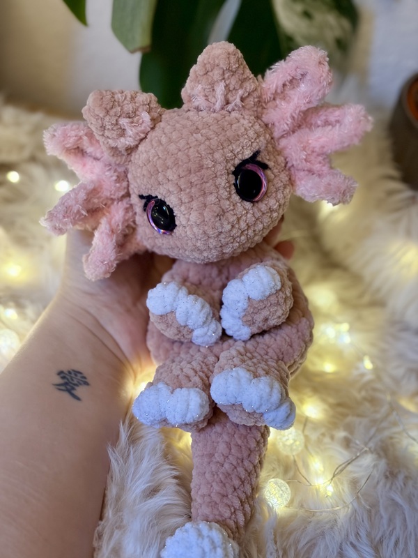 Die Figur besitzt kleine Ohren, flauschige Kiemen, niedliche Pfötchen und eine Kugel an der Schwanzspitze – perfekt zum Kuscheln, Verschenken oder Dekorieren.