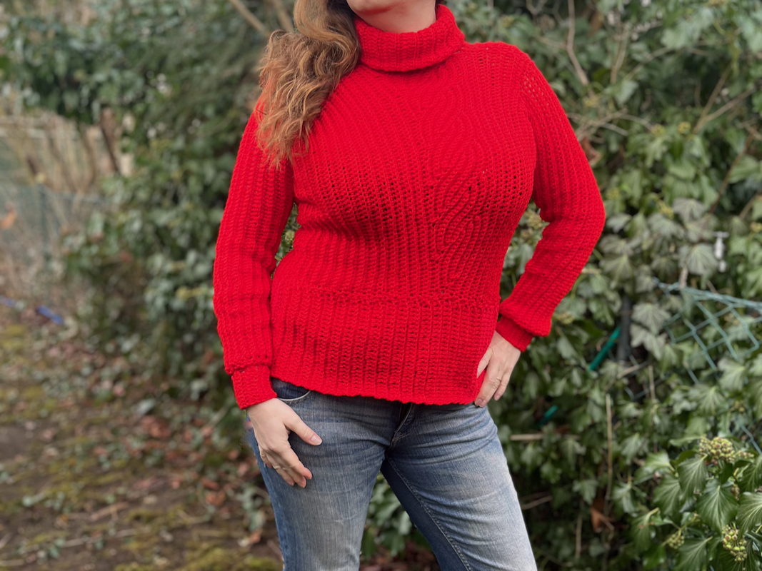 Auf 16 Seiten wird schriftlich Reihe-für-Reihe jeder Schritt des Pullovers erklärt. Zusätzlich ergänzen die 6 elektronisch erstellten Häkelschriften die Anleitung. Das integrierte Zopfmuster auf der Vorderseite wird detailliert erklärt schriftlich, in der Häkelschrift und mit Fotos erklärt.