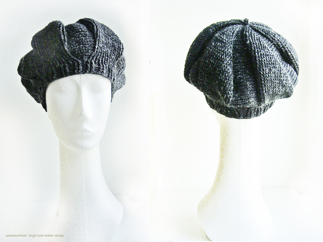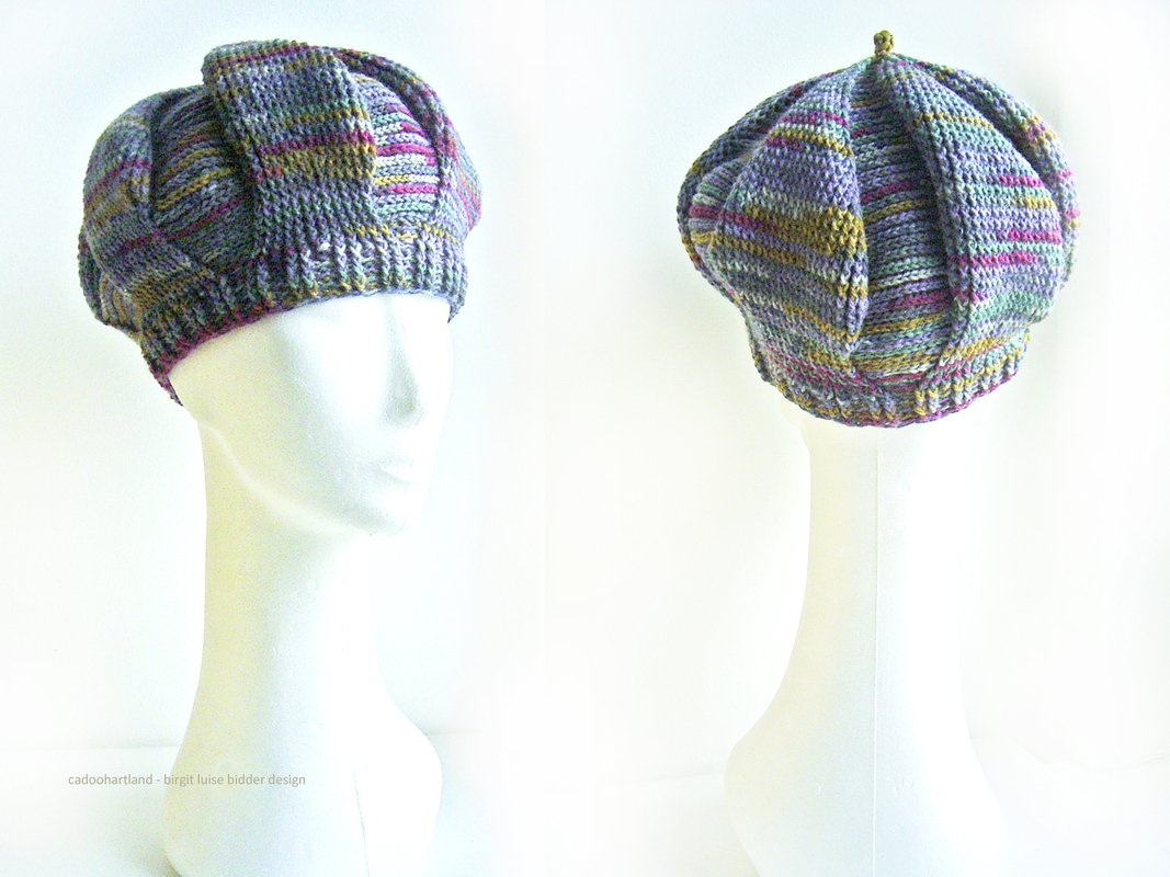 Die Windmühlen-Mütze aus Reliefstäbchen mit Abnahmen von oben nach unten bis zum Bündchen.