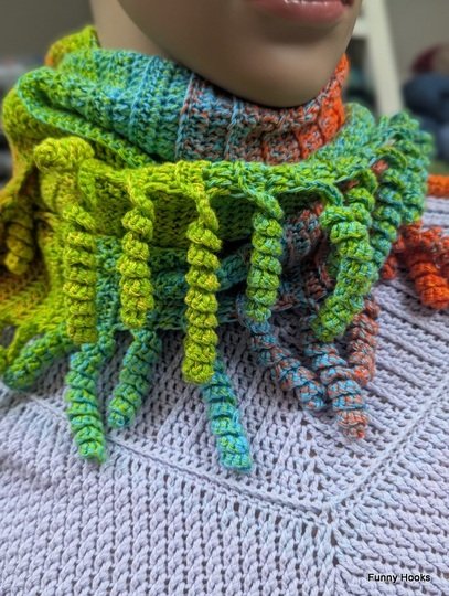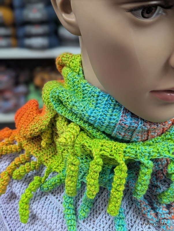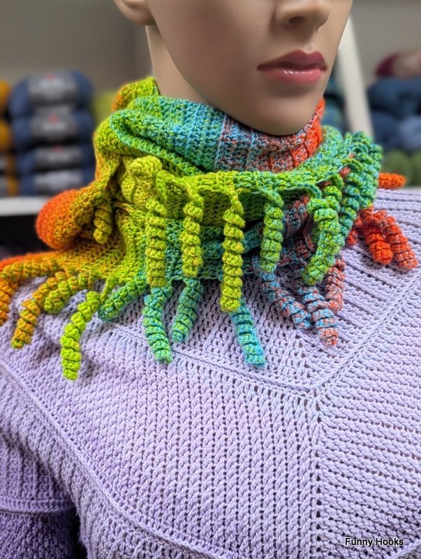 Im Test wurde zB. Farbverlaufsgarn von Funny Hooks verwendet, ob mit Baumwolle/Polyacryl, Baumwolle, Modal oder handgefärbten Strängen. Du kannst hier deiner Kreativität freien Lauf lassen.