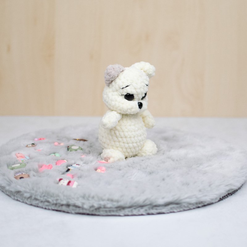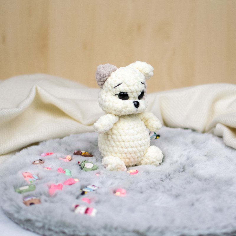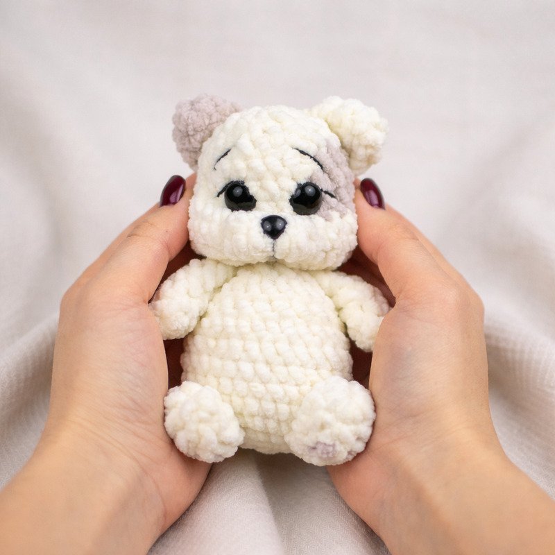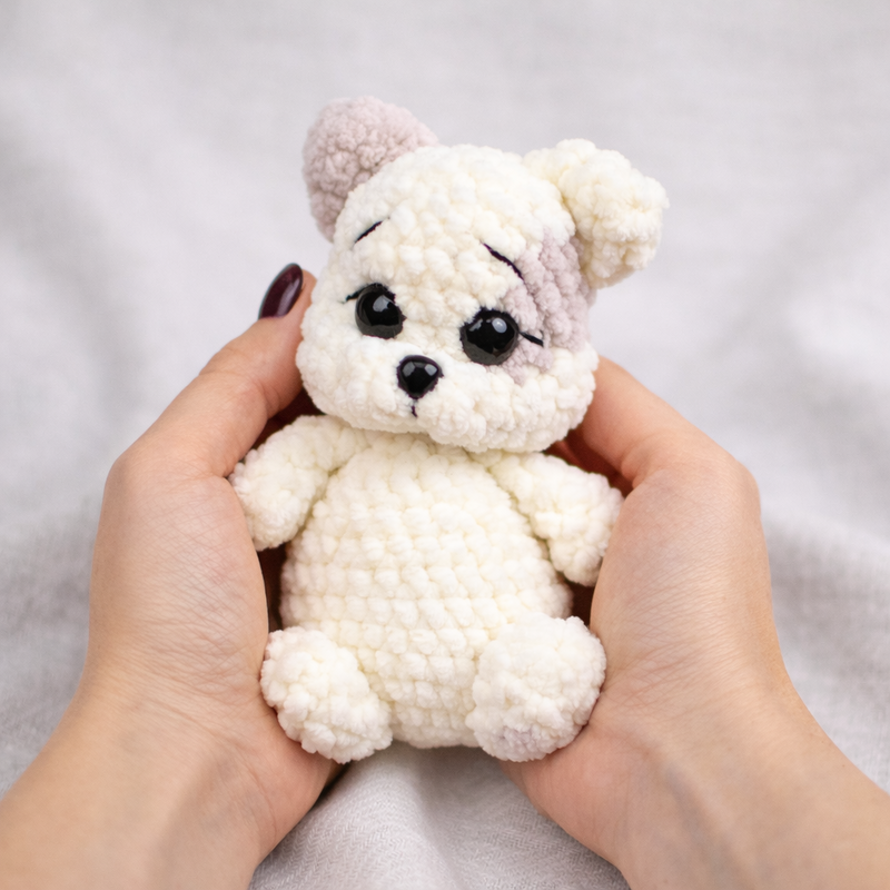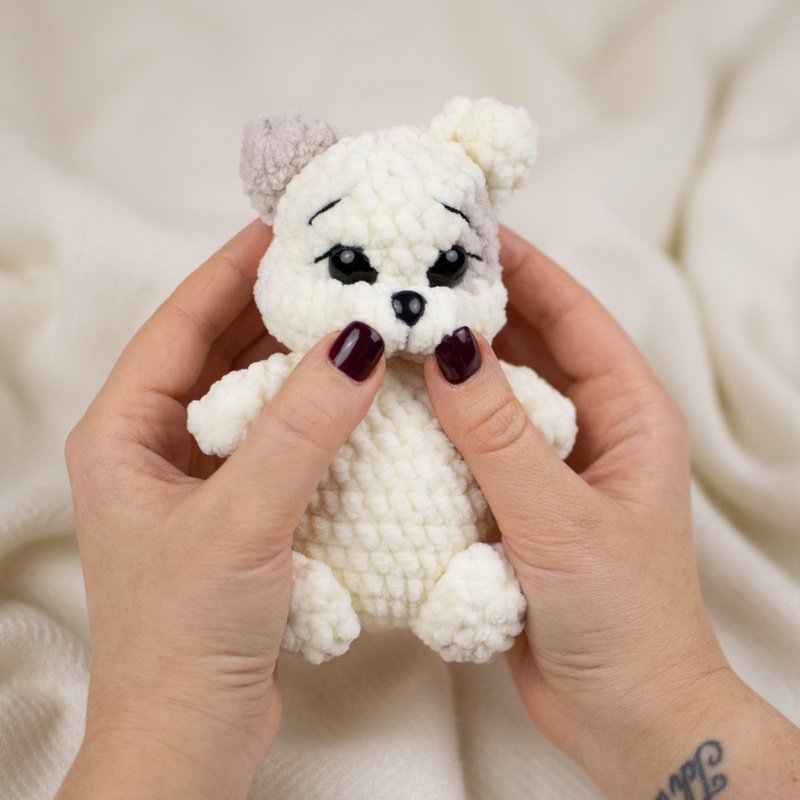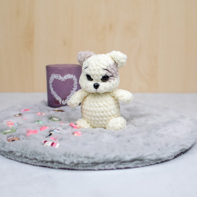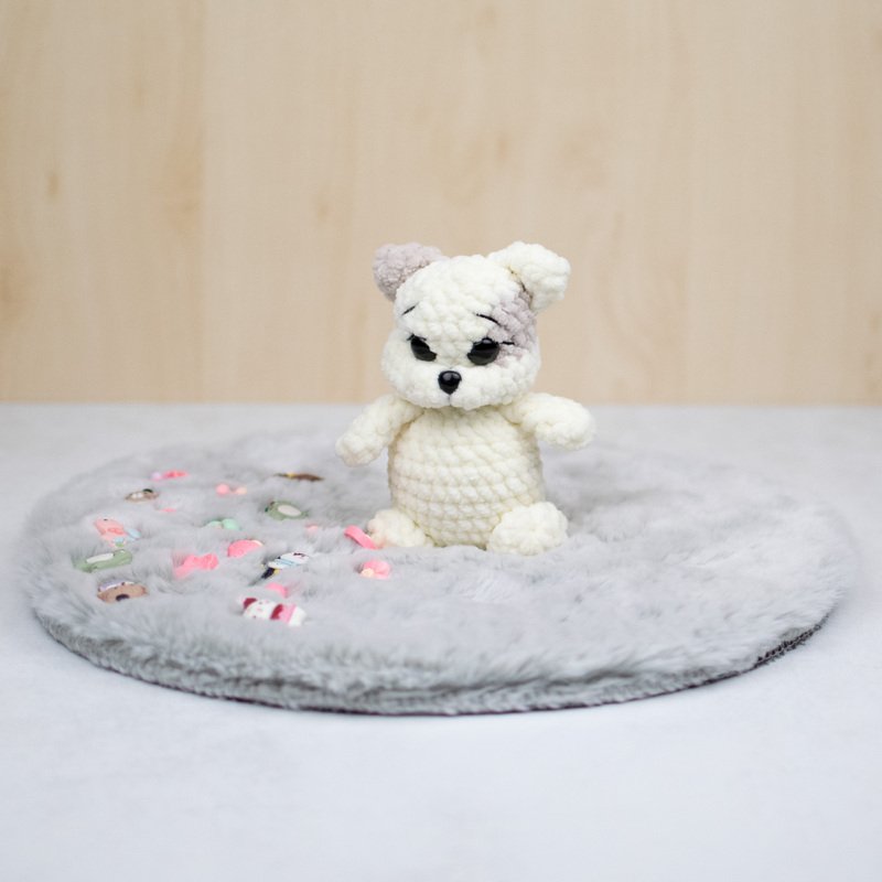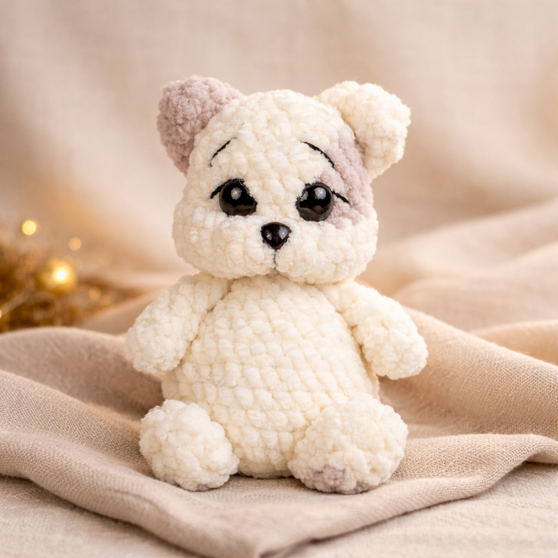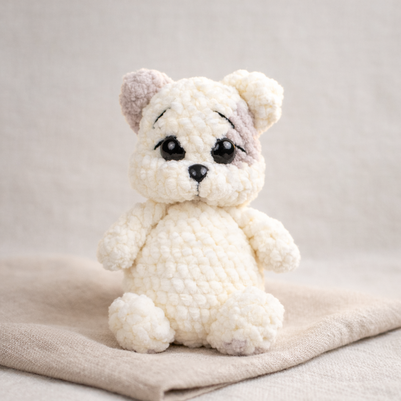Mit dieser Häkelanleitung kannst du das süße Kätzchen „Marshmallow“ selbst nacharbeiten. Die kleine Katze wird aus weichem Chenillegarn gehäkelt und erhält durch die modellierten Augen und das kleine Fleckchen am Kopf einen besonders niedlichen Ausdruck.