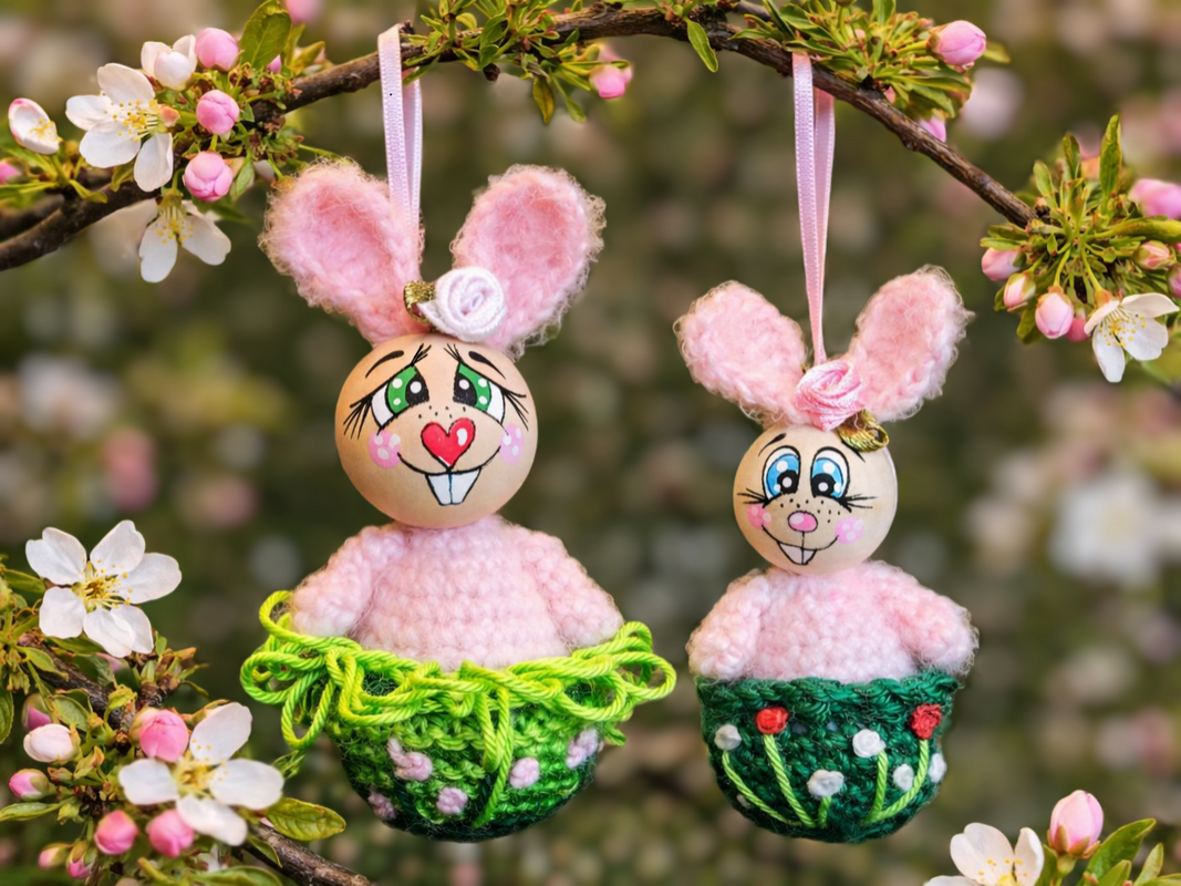 So hängen sie entweder am Frühlingsstrauch oder sitzen in dekorierten Körbchen.
