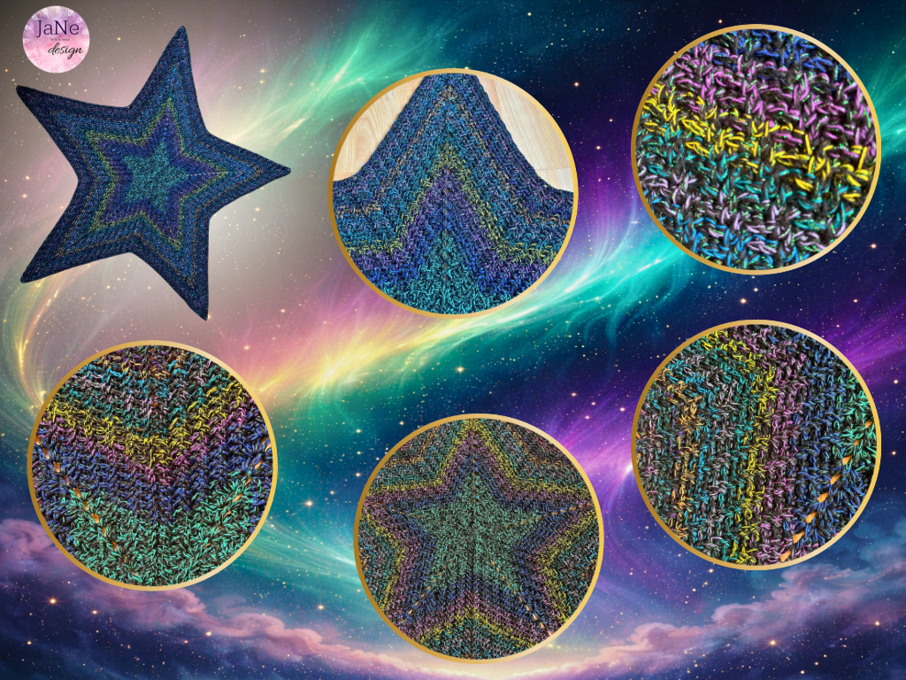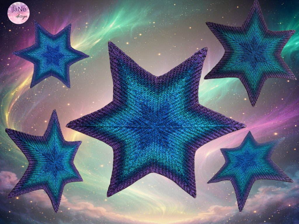 Für unsere Sterne auf dem Titelbild haben wir die Bobbel Shining und Green Space mit je 1000/4 & NS 4 verwendet. Die Bobbel sind von Wolle Bees Farbverlauf (zu finden auf Facebook).