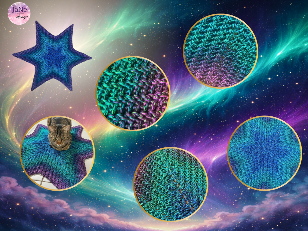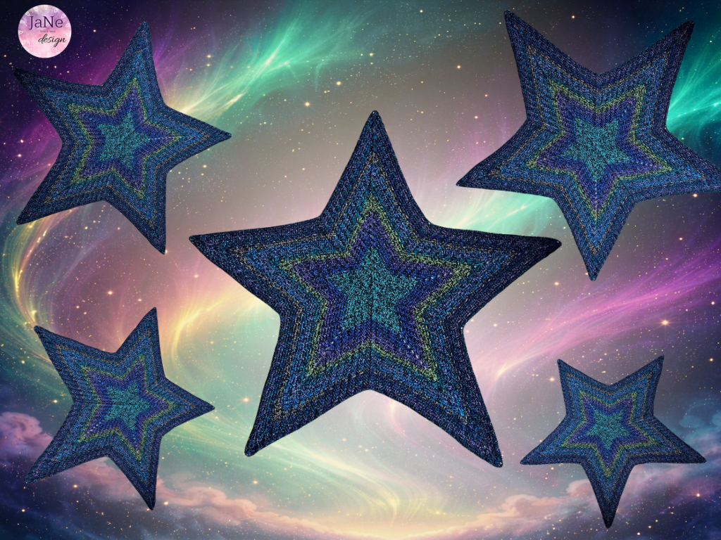 Für unsere Sterne auf dem Titelbild haben wir die Bobbel Shining und Green Space mit je 1000/4 & NS 4 verwendet. Die Bobbel sind von Wolle Bees Farbverlauf (zu finden auf Facebook).
