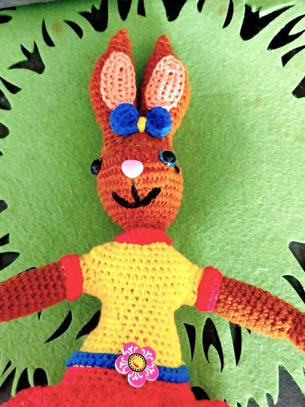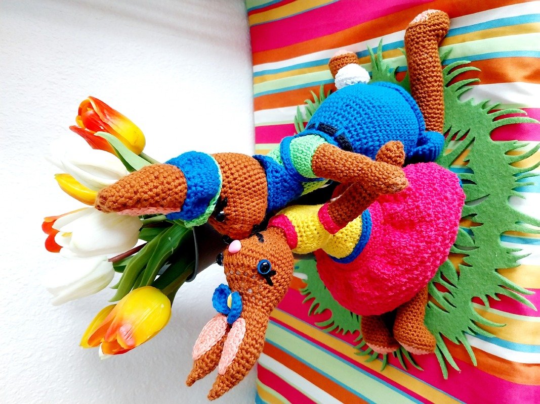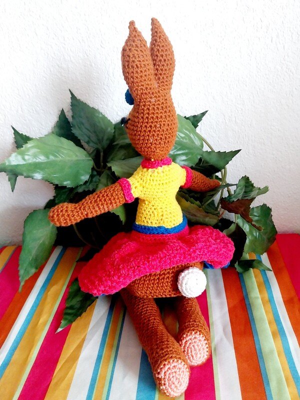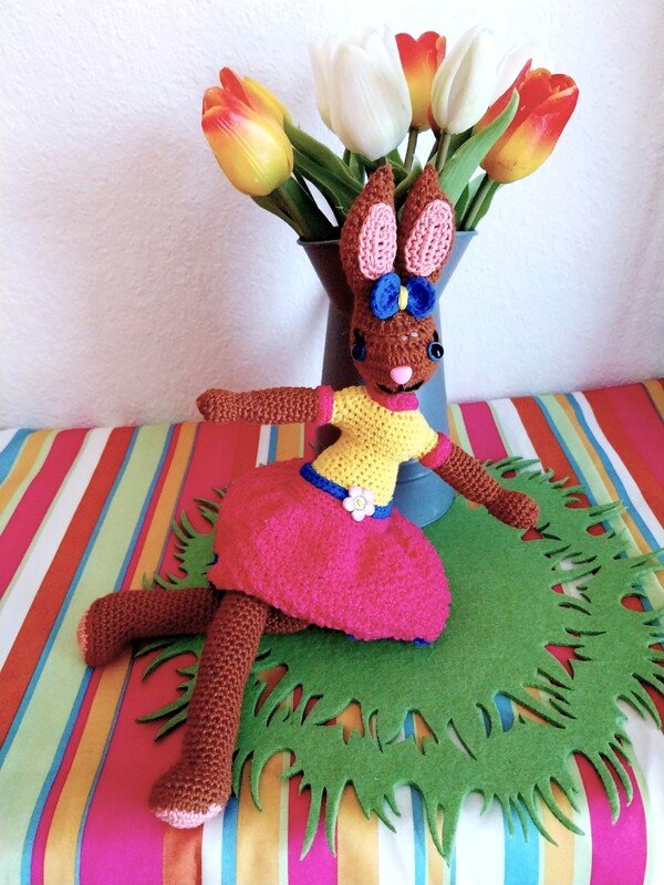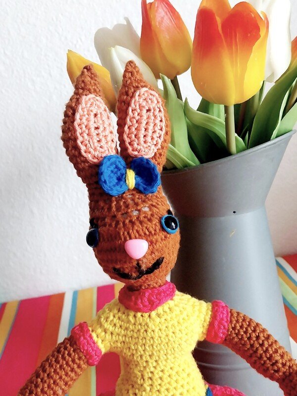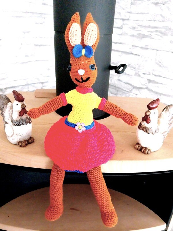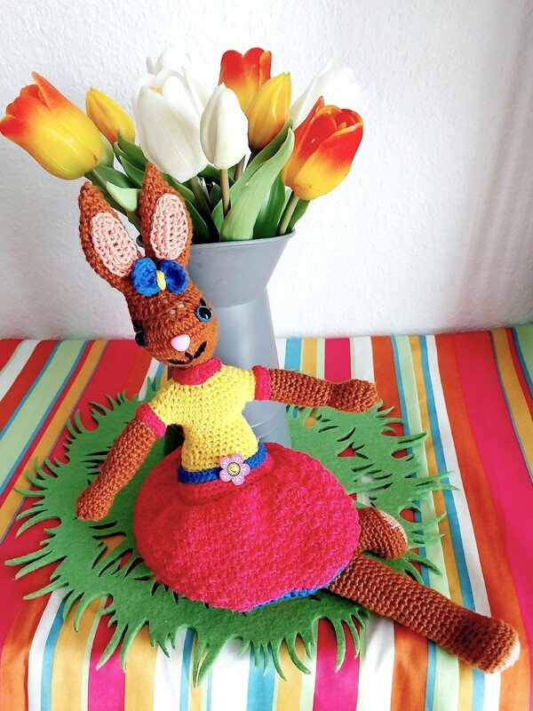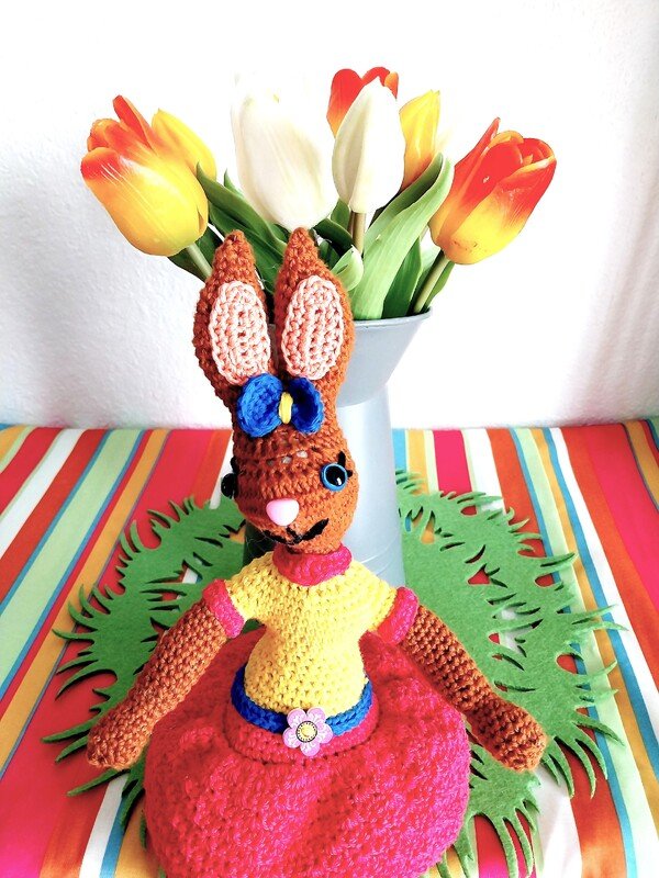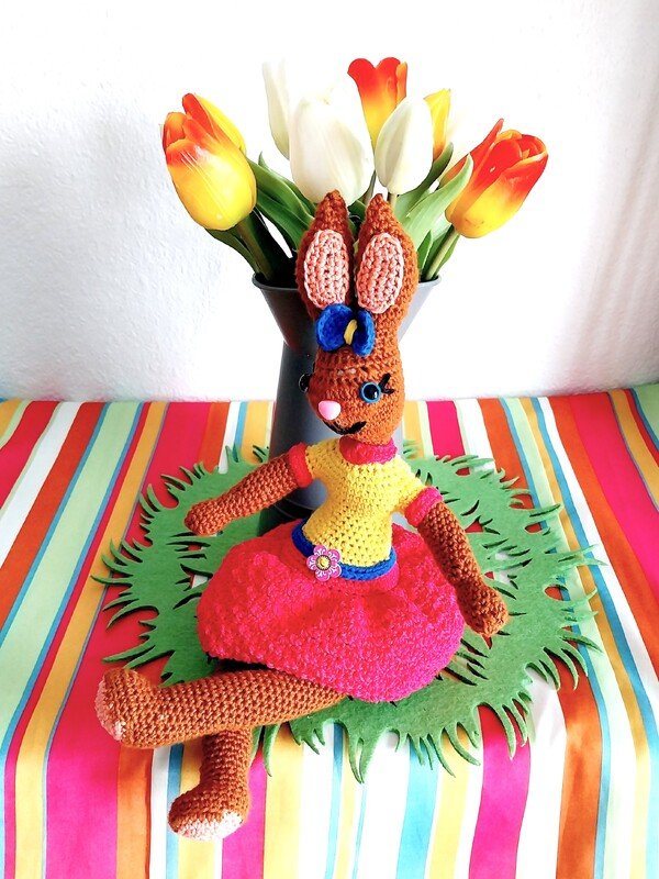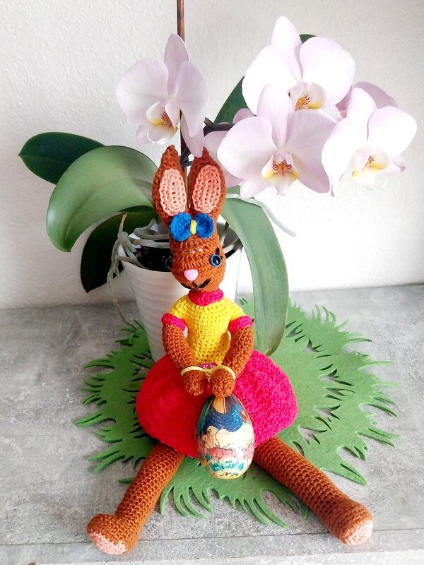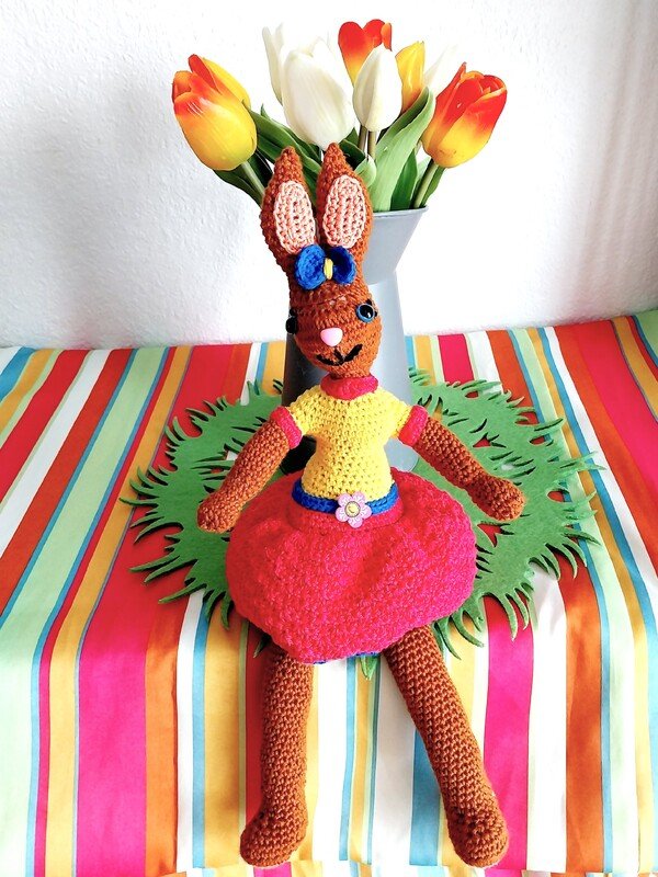 Pünktlich zur Osterzeit habe ich dieses süße " Osterhäschen" (das auch als "Kantensitzer" geeignet ist) entworfen und gehäkelt. Wie ihr seht, ist sie liebevoll mit vielen zusätzlichen Details gefertigt worden. Die fertige Figur ist sitzend ca. 25 cm hoch und insgesamt ca. 39 cm lang. Sie wurde mit einer Häkelnadel Nr. 2,5 und mit 100% Baumwollgarn gefertigt.