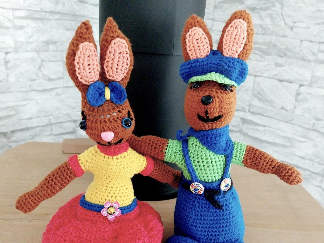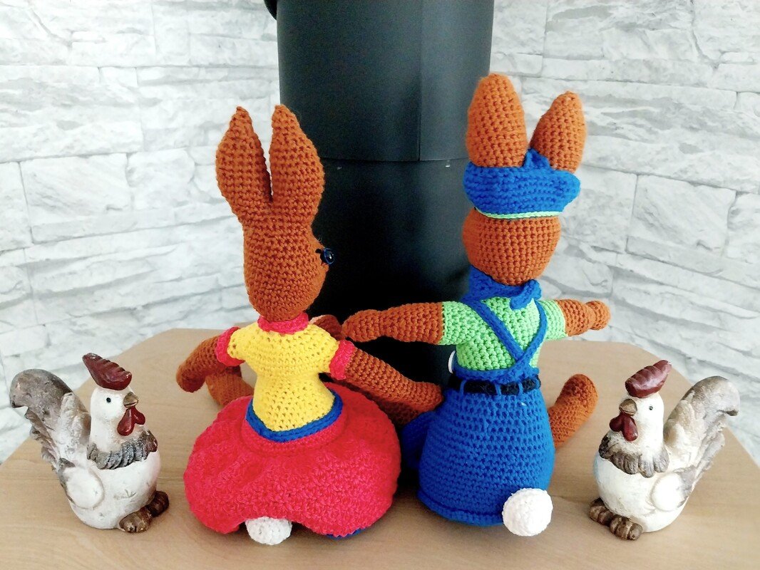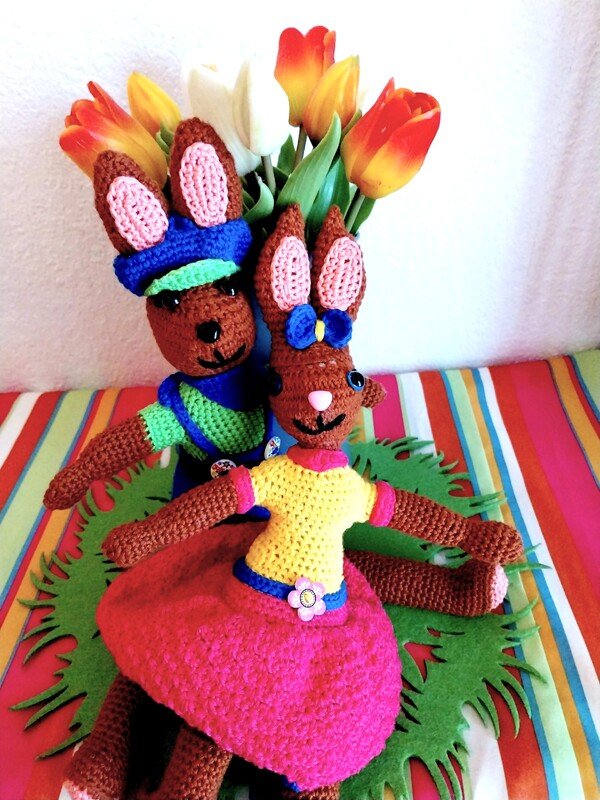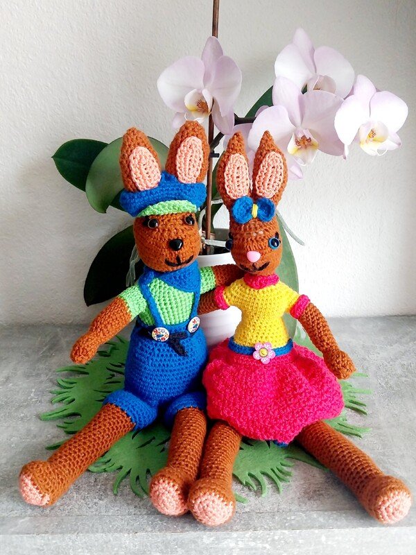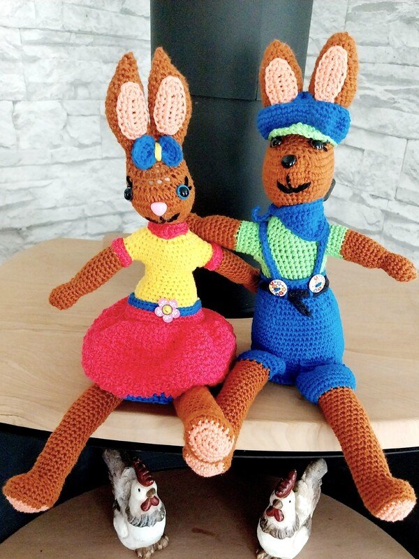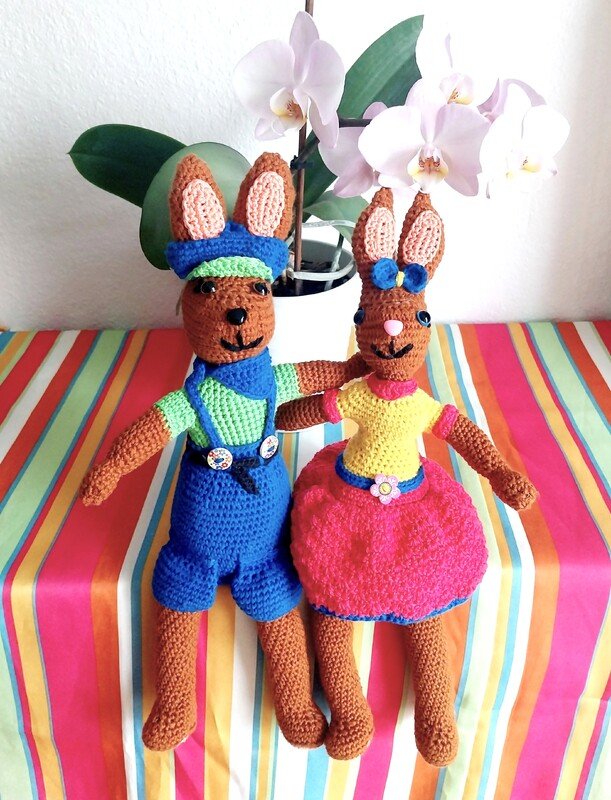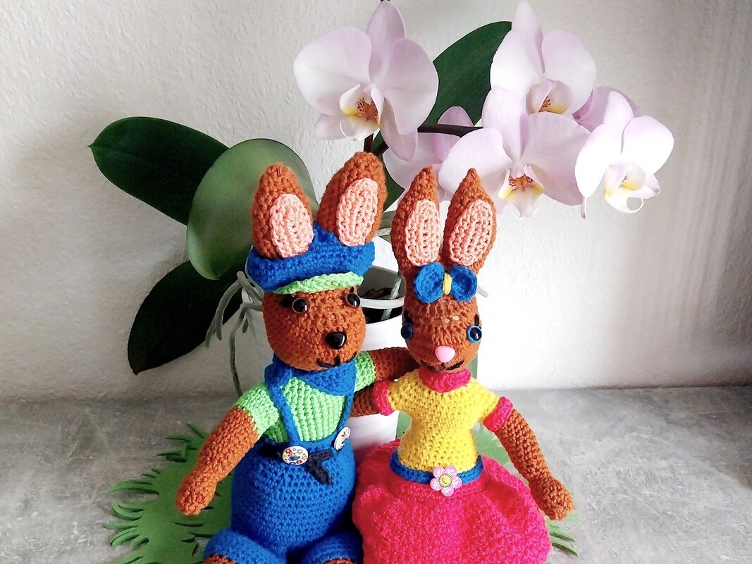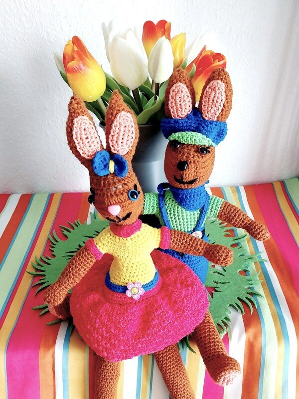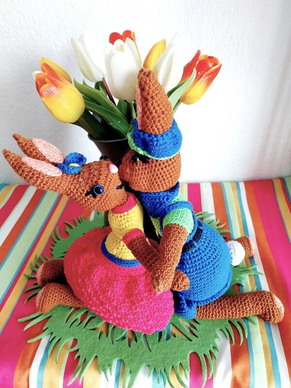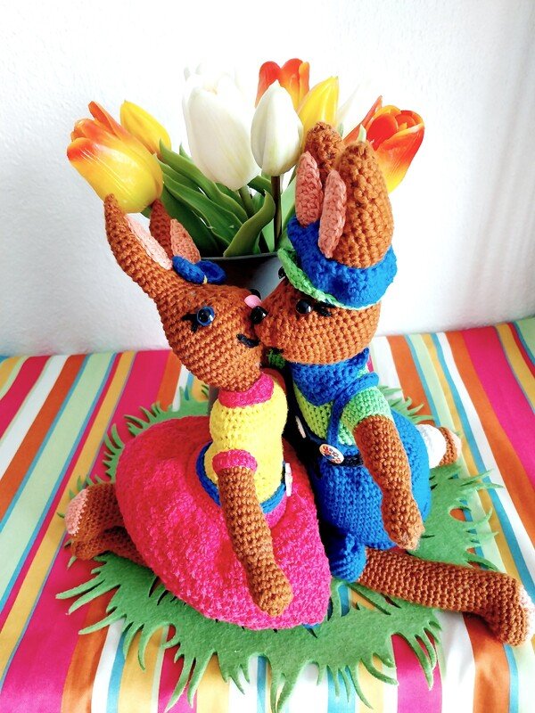 Pünktlich zur Osterzeit habe ich dieses süße, verliebte " Osterhasen Pärchen" (die auch als "Kantensitzer" geeignet sind) entworfen und gehäkelt. Wie ihr seht, sind Beide liebevoll mit vielen zusätzlichen Details gefertigt worden. Die fertigen Figuren sind sitzend ca. 25 und 27 cm hoch und insgesamt je ca. 39 cm lang, und wurden mit einer Häkelnadel Nr. 2,5 und mit 100% Baumwollgarn gefertigt.