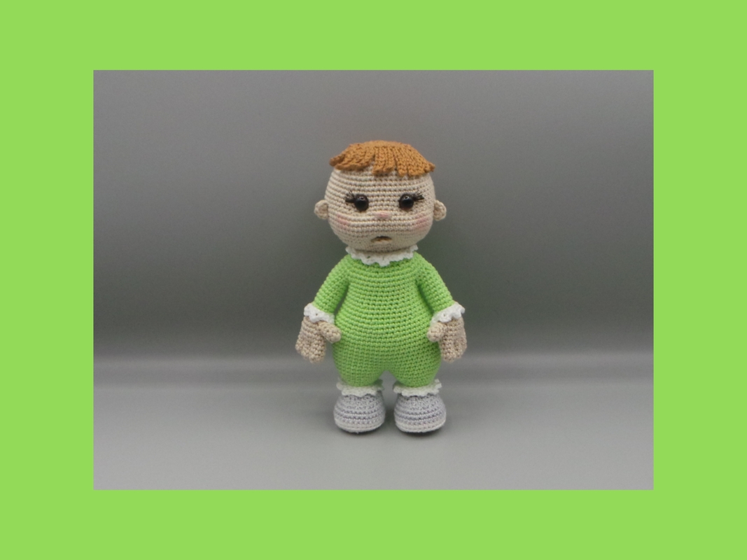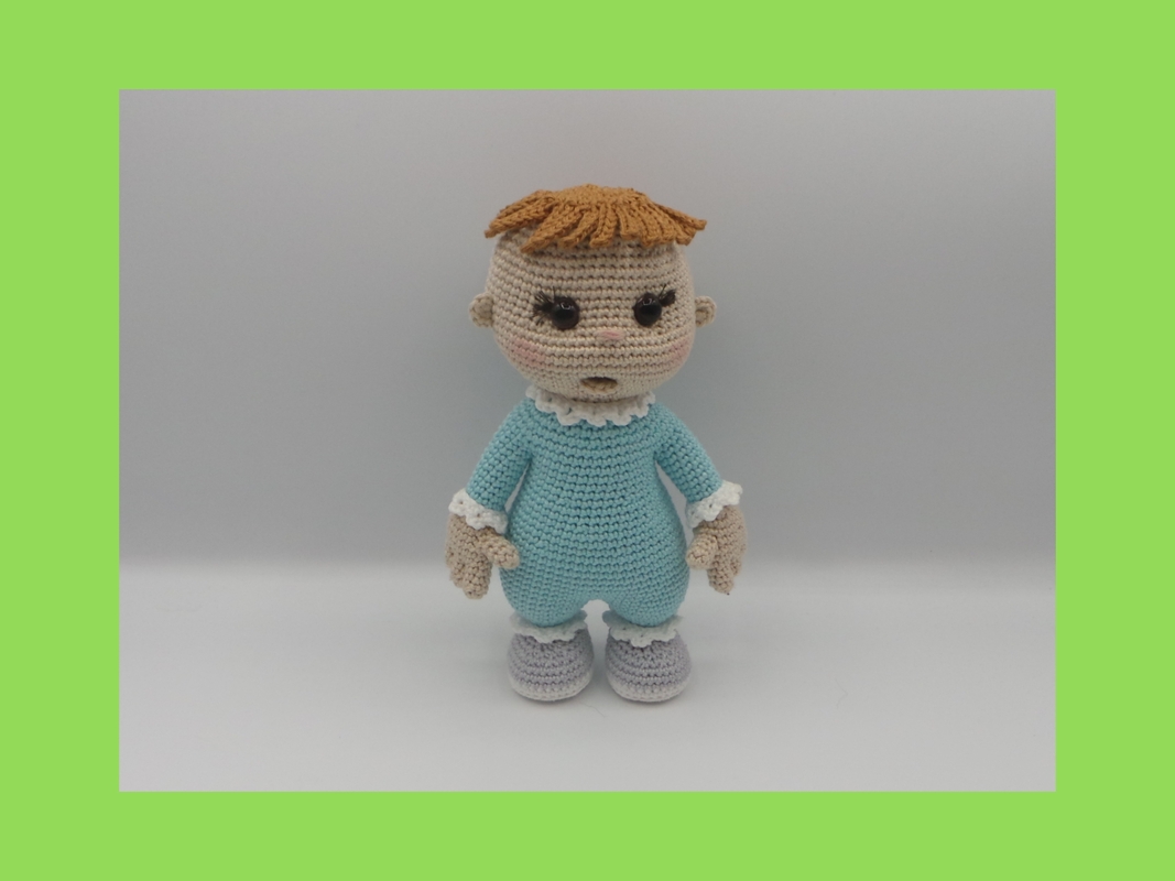 Lausbub Luca ist etwa 20 cm groß vom Kopf bis zu den Füßen, gearbeitet mit einem Baumwollgarn, 50 g/125 m und Häkelnadel 2,5 mm.