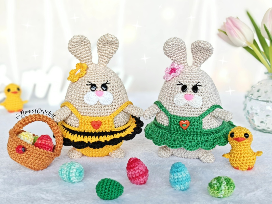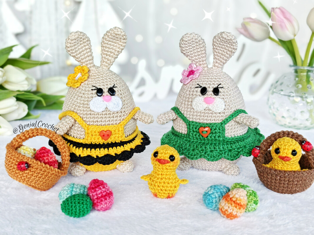 Das Häschen und das Kleid werden in einem Stück gehäkelt (das Kleid ist nicht abnehmbar). Die Arme und Beine werden während des Häkelns mit festen Maschen an den Körper angehäkelt. Ein Korb mit gehäkelten Eiern und ein kleines Küken vervollständigen diese bezaubernde Osterdekoration.