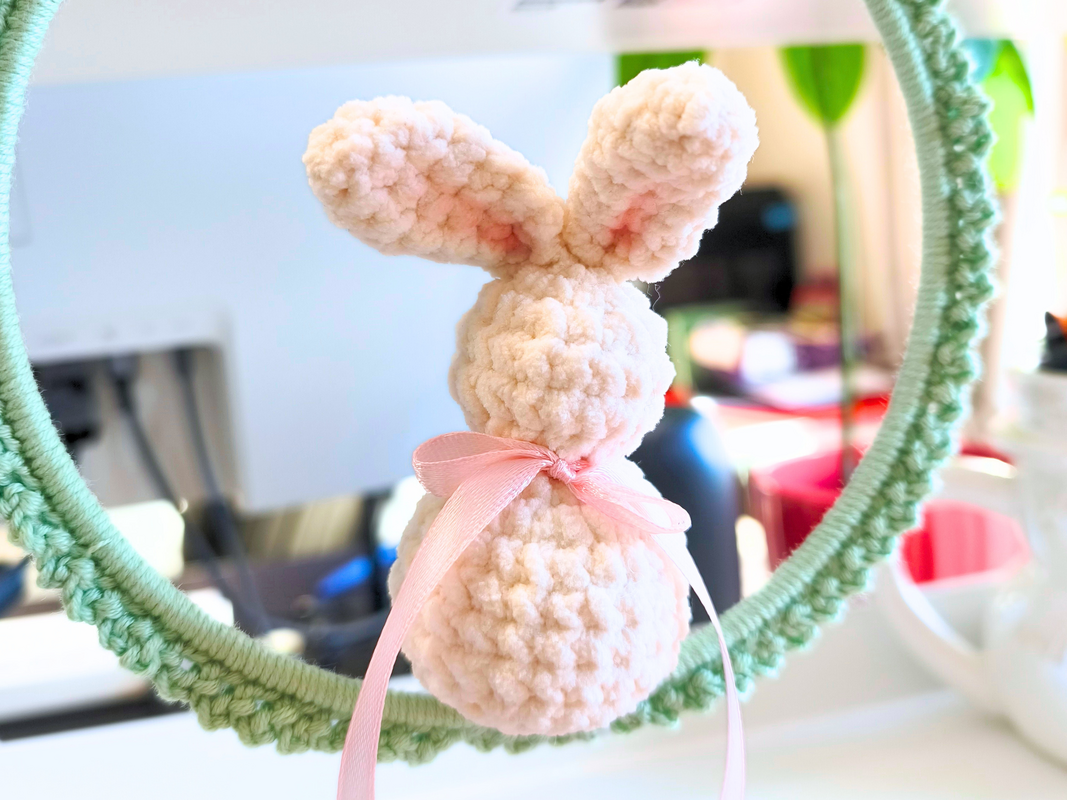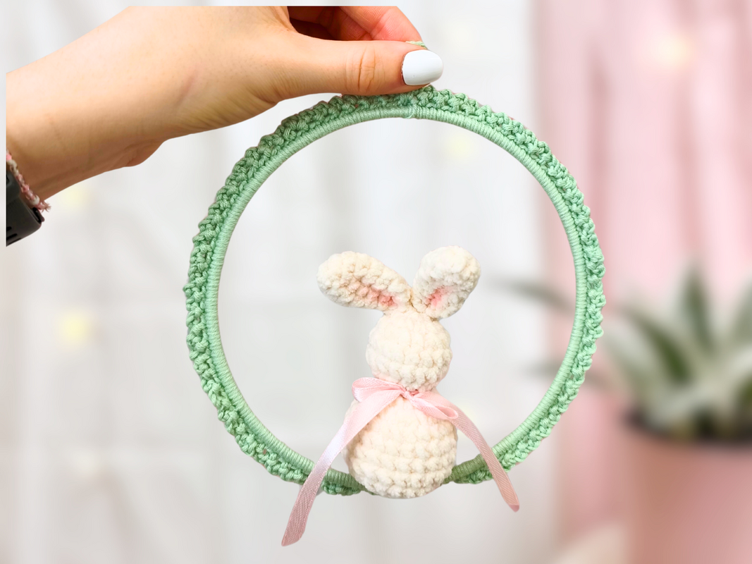 Mit dieser Häkelanleitung für einen Dekoring mit kleinem Hasen gestaltest du eine liebevolle Osterdekoration. Der dekorative Ring mit integriertem Amigurumi-Hasen eignet sich perfekt als Frühlingsdeko, Türkranz oder Geschenkidee.