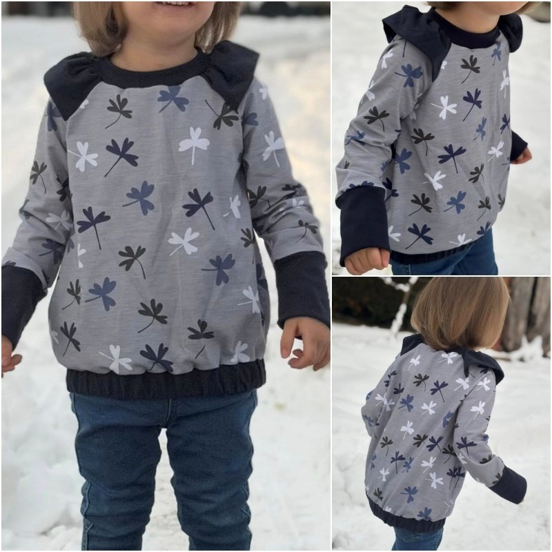 • Für den Sweater sind dickere, gut dehnbare Stoffe vorgesehen. French Terry ist perfekt. Für die Flügelchen ist Jersey empfehlenswert aber nicht dringend nötig