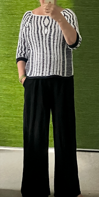 Verbrauch für den Pulli in Größe 40 mit 3/4 Ärmel: 600 g. Zur Hälfte jeweils in Farbe weiß und Farbe schwarz.