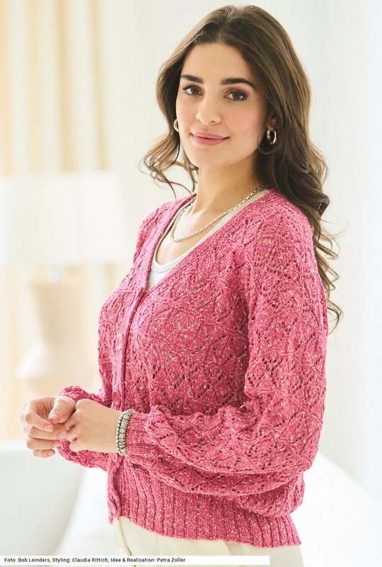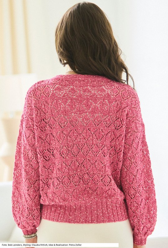Diese Jacke begeistert mit einem Ajourmuster, das an Blätter erinnert und einem das wir Rauten aussieht – durch den Melange-Effekt des Garns wird die Struktur noch unterstrichen. Ein lässiger Oversized-Schnitt und weite gerade eingesetzte Ärmel sorgen für Bequemlichkeit. Schmale Bündchen an den Ärmeln und breite am Saumrand werden im Rippenmuster 3 rechts, 2 links gestrickt. Die Knopfblende wird jedoch extra gearbeitet im Halbpatent, sie verläuft nach dem Annähen rund um den Halsausschnitt. Eine Anleitung kann für die Größe 38/40 downgeloadet werden.