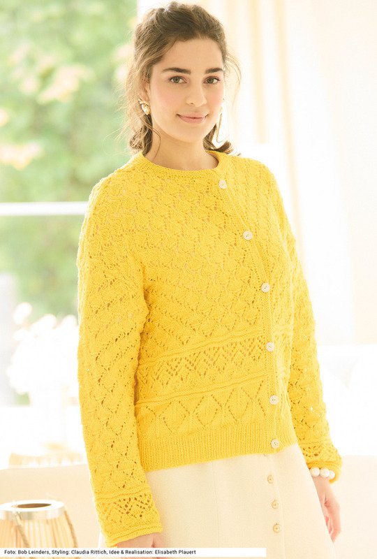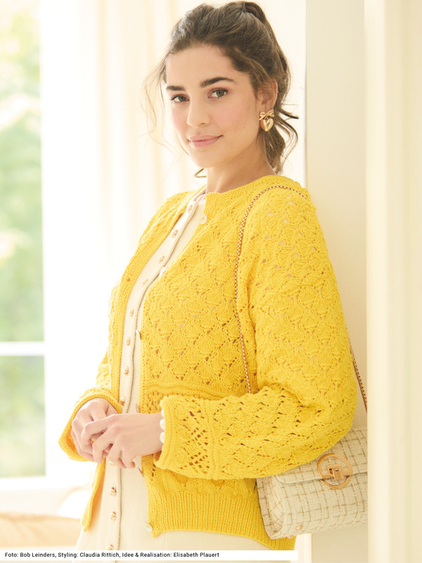 Jede Strickerin, die es liebt, nicht einfach nur geradeaus mit einfachem Muster zu stricken, wird dieses Modell lieben. Die Jacke aus einem Baumwollgarn mit Polyester-Stretchanteil begeistert mit verschiedenen Ajour- und Strukturmustern, die für Abwechslung sorgen. Ein feminines Modell für jeden Tag, das mit klarer Form und sommerlicher Ausstrahlung punktet. Während der Bund im Rippenmuster gesarbeitet ist, haben die Vorderteilränder bzw. die Knopfleisten und der Halsausschnitt einen kraus rechts gestrickten Rand. Die Anleitung kann für die Größen 36/38, 42/44 und 48/50 downgeloadet werden.