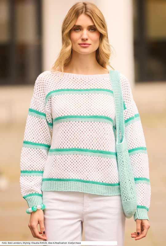 Bei diesem baumwollene Pullover sorgt ein netzartiges Ajourmuster für eine feine Struktur, während die kontrastierenden Streifen dank der harmonisch aufeinander abgestimmten Farben sanft ineinander übergehen. Die mit demselben Netzmuster gestrickte Tasche hat einen Boden und einen Abschluss samt Träger in kraus rechts. Sie ergänzt den Pullover auf geniale Weise. Die Bündchen und die Blende am runden Halsausschnitt werden im Rippenmuster 1 rechts verschränkt, 1 links gearbeitet. Eine Anleitung gibt es für die Größen 36/38, 40/42 und 44/46 und für die Tasche mit 27 x 33 cm.
