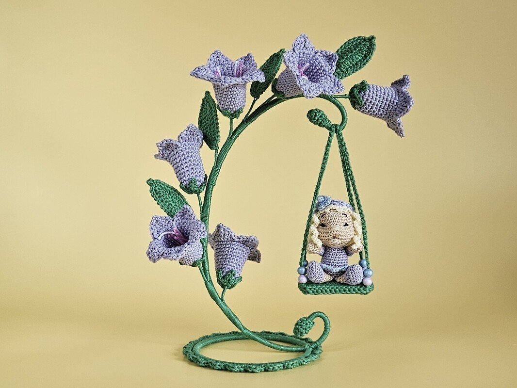 Zart, verspielt und voller Blütenzauber: Mit dieser Häkelanleitung entsteht das Blumenkind Glöckchen Glockenblume, das unter einem Bogen aus gehäkelten Glockenblumen auf einer kleinen Schaukel sitzt.