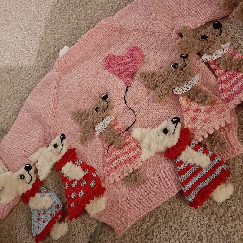 Die Applikationen werden gestrickt. In der Anleitung wird alles step-by-step erklärt. Dabei helfen auch viele Fotos. Das Kleid wird mit einem Nadelspiel gestrickt.