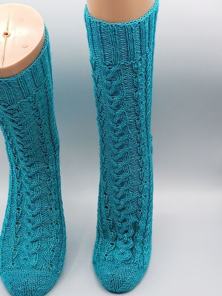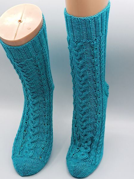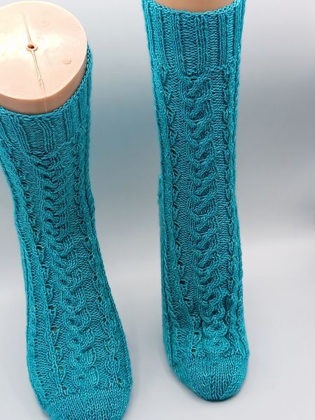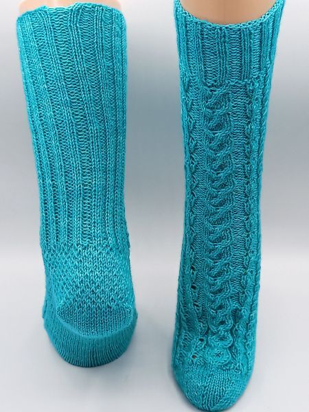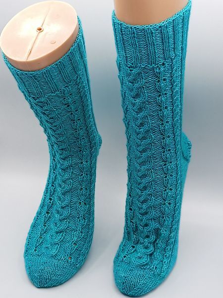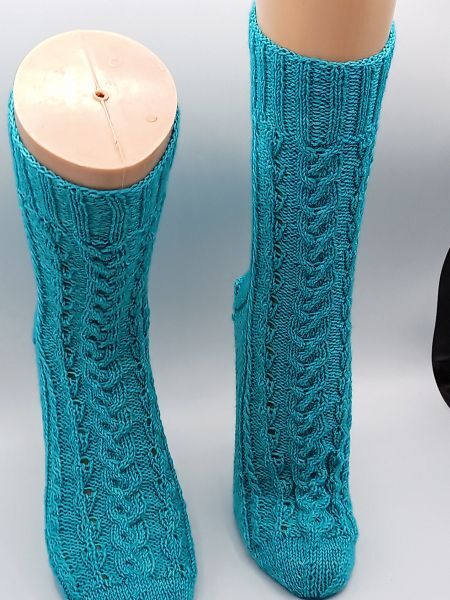 Entdecke ein wunderschönes Muster, das von den alten Kelten inspiriert ist. Das Muster zeigt verzopfte Linien und kleine Blätter, die von linken Maschen eingerahmt sind. Es verleiht deinen Socken einen besonderen, ansprechenden Look.