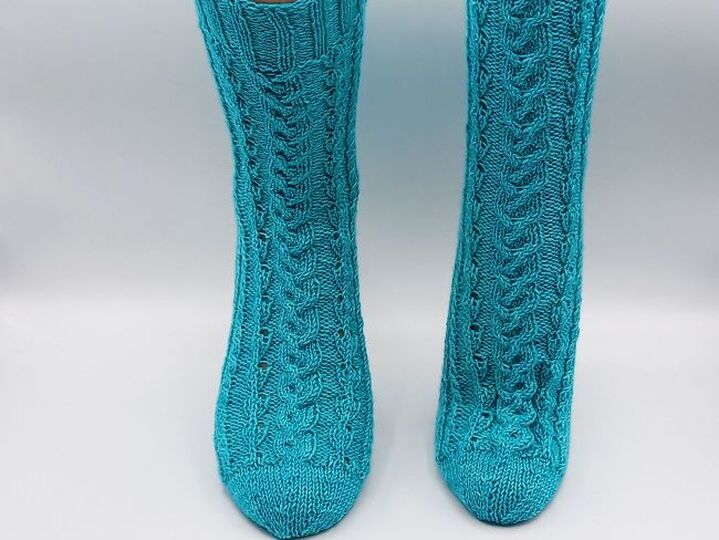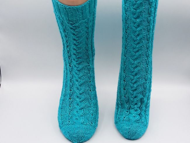 Dieses Muster passt gut bei 64, 68 und 72 Maschen. Es wird auf der Oberseite des Sockens verteilt und sieht auf beiden Seiten sehr schön aus. Das Muster ist so ausgelegt, dass du die Maschenzahl durch den Zopf nicht erhöhen musst – eine ausgewogene Konstruktion.