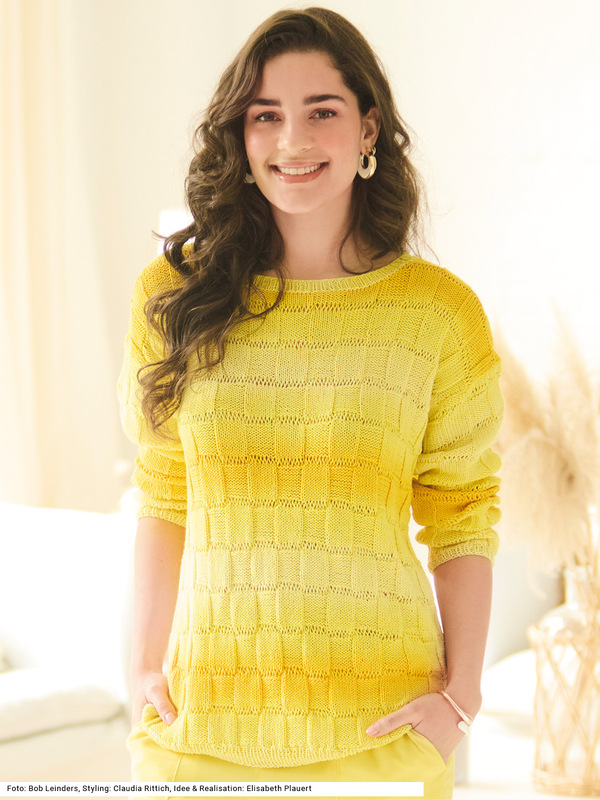 Der klassische, ganz gerade geschnittene Pulli aus Farbverlaufsgarn überzeugt mit seinem markanten Schachbrettmuster, das durch jeweils zwei Reihen mit langgezogenen Maschen unterbrochen ist. Der lässige, etwas längere Schnitt und das leichte Garn aus reiner Baumwolle garantiert angenehme Bequemlichkeit. Saum- und Ärmelbündchen sowie die Blende am runden Halsausschnitt werden im 1/1-Rippenmuster gesteickt. Da die Seitenlinien ganz gerade sind, ergeben sich überfallende Schultern. Durch die gerade endenden Ärmel ist das Einnähen ein Kinderspiel. Eine Anleitung gibts für die Größen 36/38, 40/42 und 44/46.