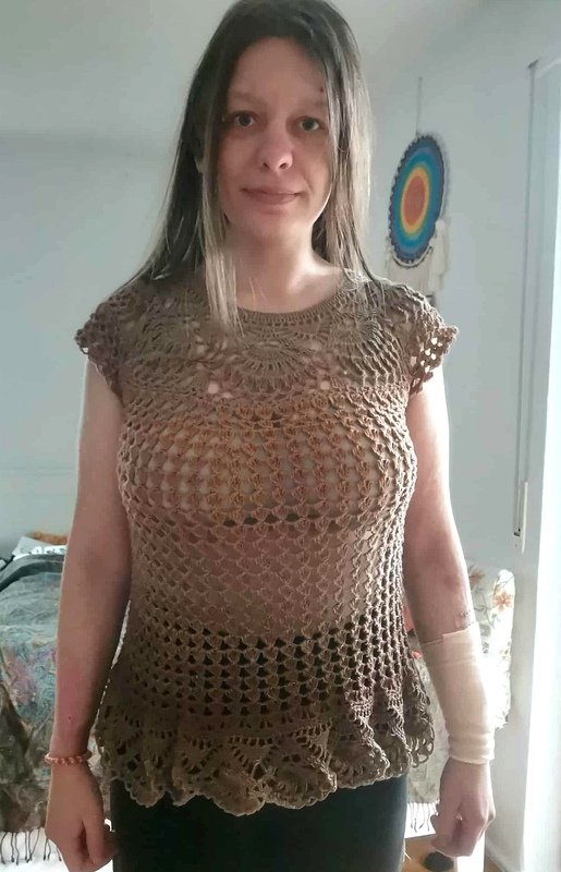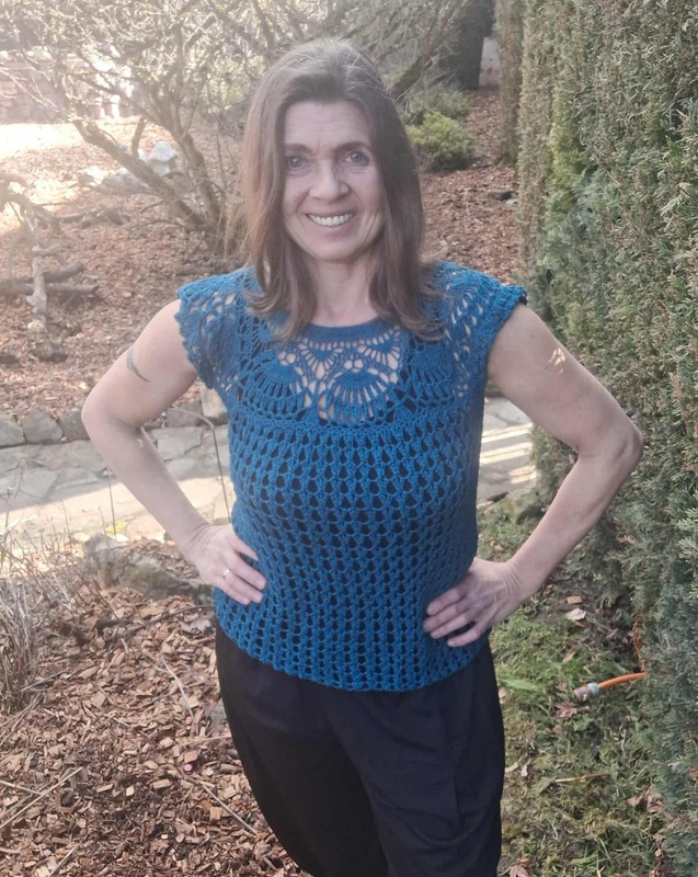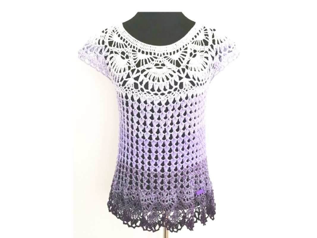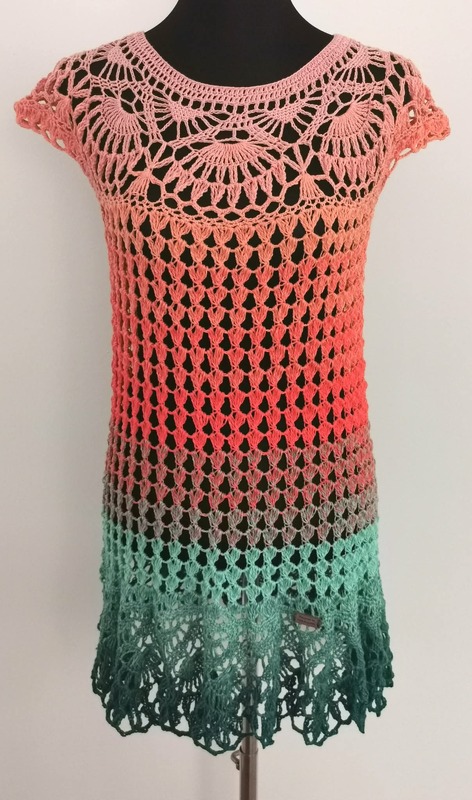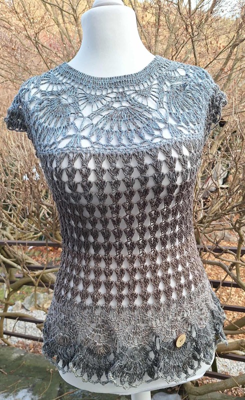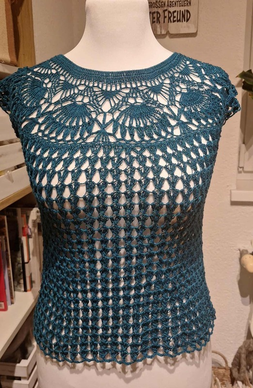 Es kann als Shirt ohne Spitzenabschluß oder als Tunika oder Kleid mit dem wunderschönen Spitzenabschluß gehäkelt werden.