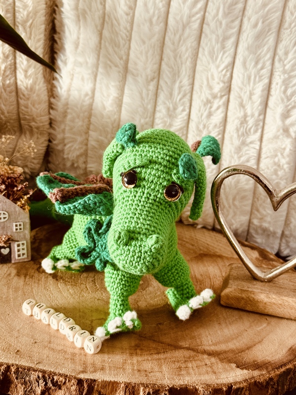 Thaldrin bedeutet auch “Der, der im verborgenen Tal lebt” und ist ein junger Walddrache. Im tiefen, moosbewachsenen Wald, wo die Sonnenstrahlen nur als tanzende Lichtpunkte den Waldboden erreichen, lebt der kleine Thaldrin. Er besteht aus Wolle und einem funken Magie. Seine besten Freunde sind flinke Eichhörnchen, singende Vögel und weise Eulen. Am liebsten ruht er sich auf den breiten Blättern von Farnen aus.