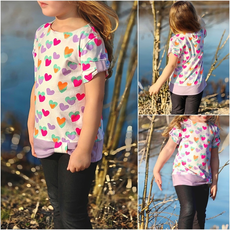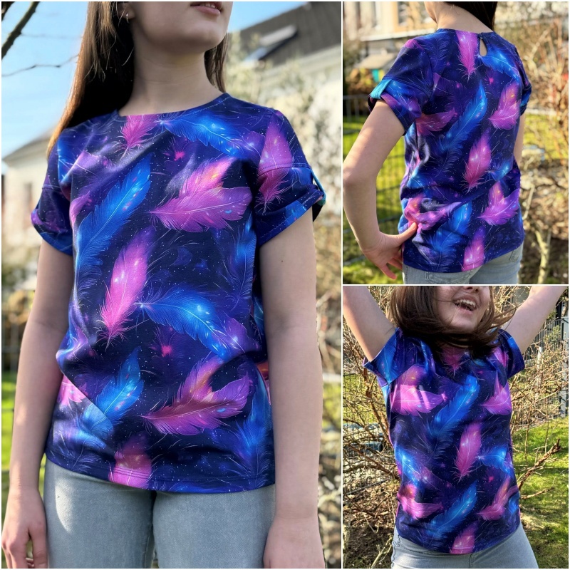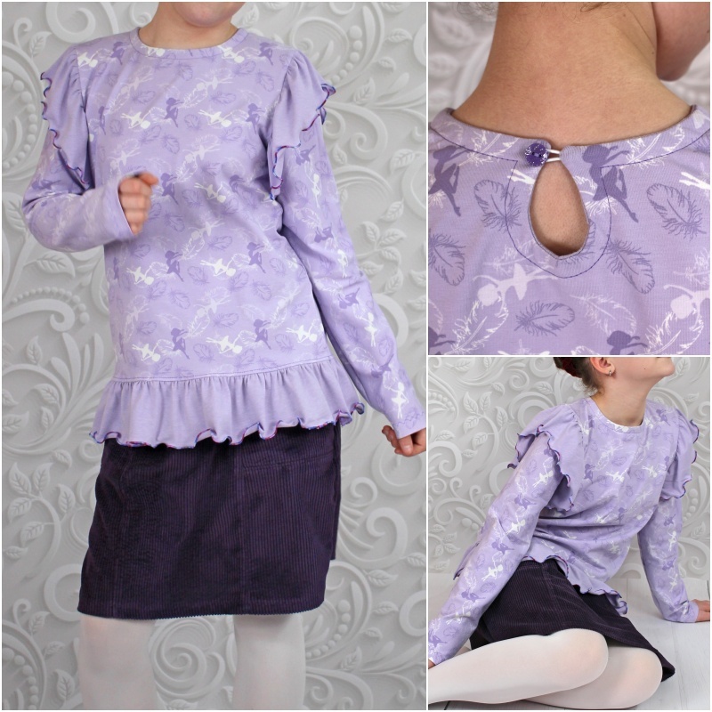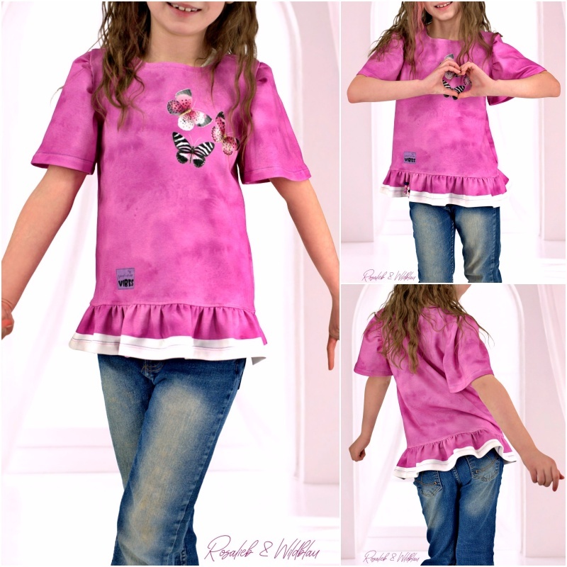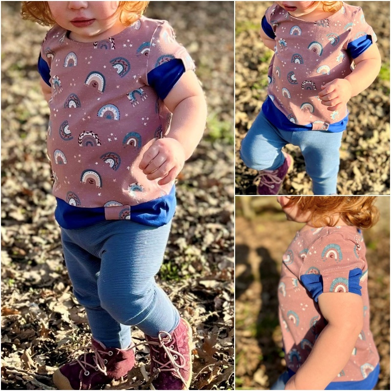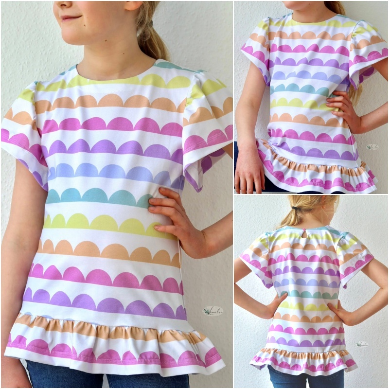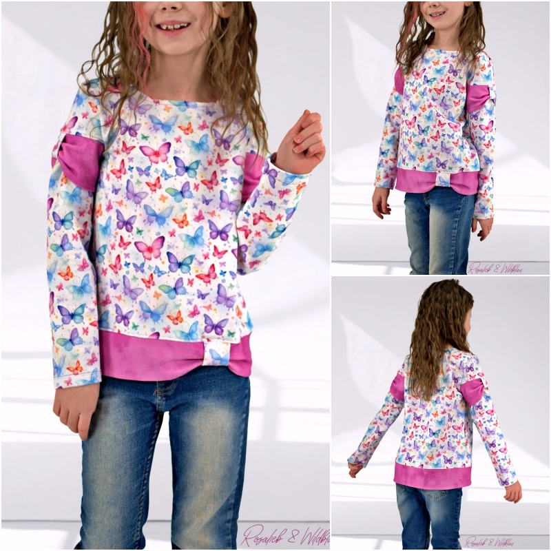 Das Schnittmuster Veilchenzart ist ein herrlich wandelbares Shirt, das einfach zu jeder Gelegenheit passt und dich durch das ganze Jahr begleitet. Trotz seiner unkomplizierten Basicform sorgen die vielen tollen Varianten dafür, dass beim Nähen nie Langeweile aufkommt und immer wieder neue Looks entstehen. Alle Versionen von Veilchenzart haben dabei zwei feste Grundbausteine gemeinsam: Du hast die Wahl zwischen einer geraden oder einer leicht taillierten Seitenführung, und der Halsausschnitt wird immer edel mit einem Beleg sowie einem praktischen Schlüssellochausschnitt am Rückteil verarbeitet. Neben diesen Grundlagen kannst du dein Shirt am unteren Abschluss ganz nach deinem Geschmack gestalten: Wähle zwischen einem klassischen Saum, einem verspielten Schleifenabschluss oder einer romantischen Abschlussrüsche. Auch bei den Ärmeln bist du für jede Jahreszeit gewappnet. Es gibt den normalen Saumärmel in kurz und lang sowie eine spezielle Schleifenergänzung, die du sowohl an kurzen als auch an langen Ärmeln umsetzen kannst. Ein besonderes Highlight sind die drei verschiedenen Flügelärmel-Varianten, die im Schnittmuster enthalten sind. Diese kannst du entweder ganz solo als sommerliche Ärmel nähen oder für einen besonderen Lagen-Look kreativ mit dem langen Ärmel kombinieren.