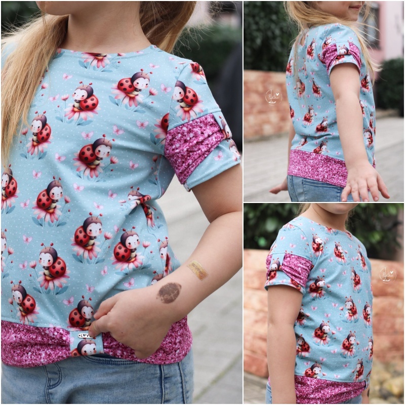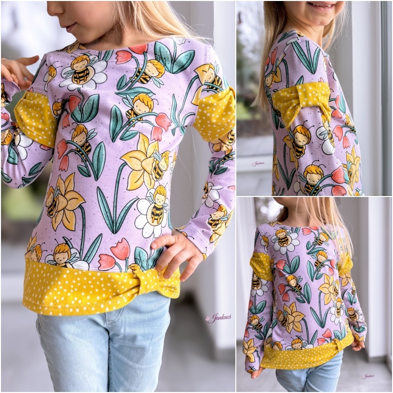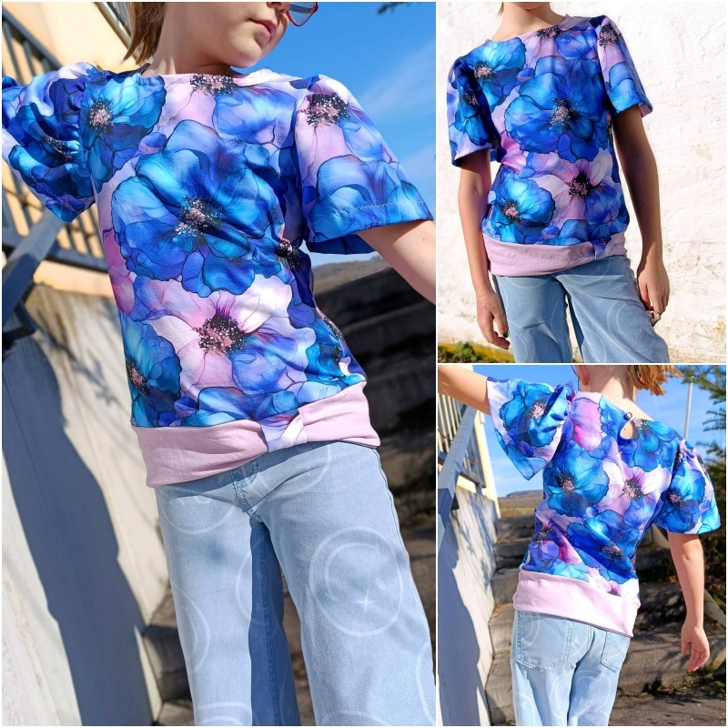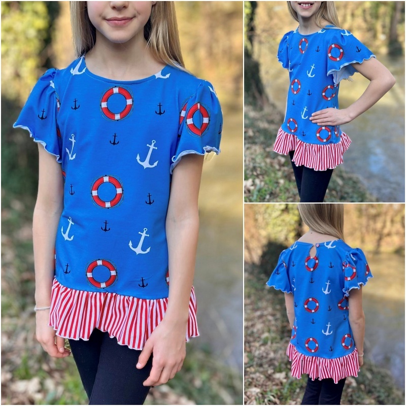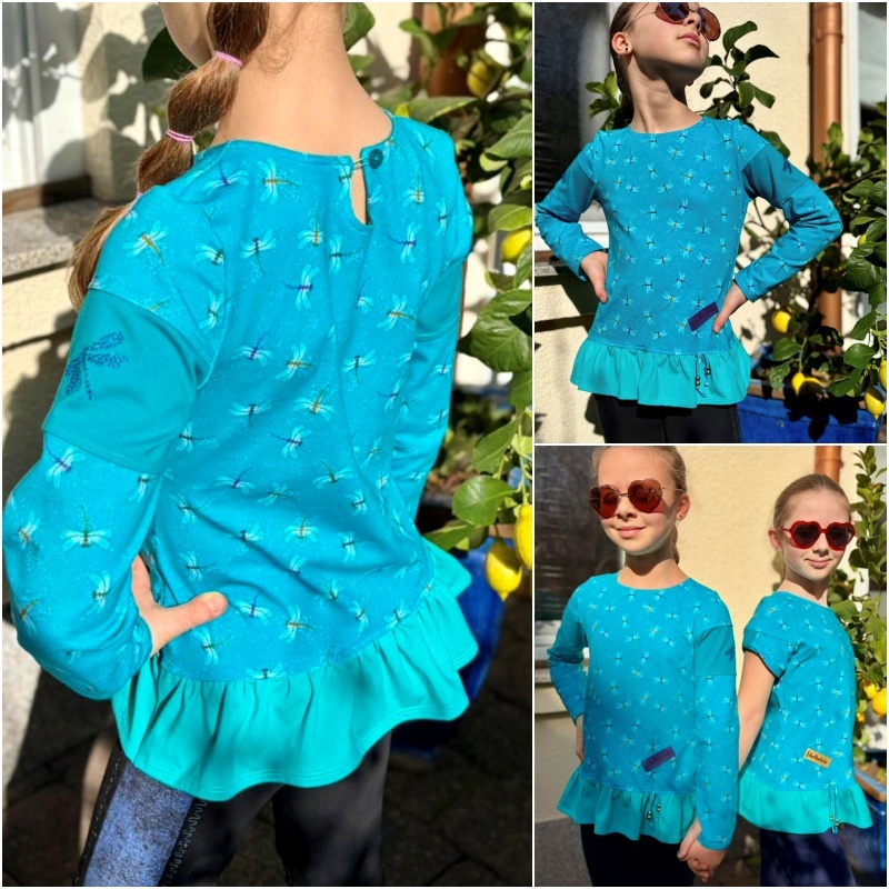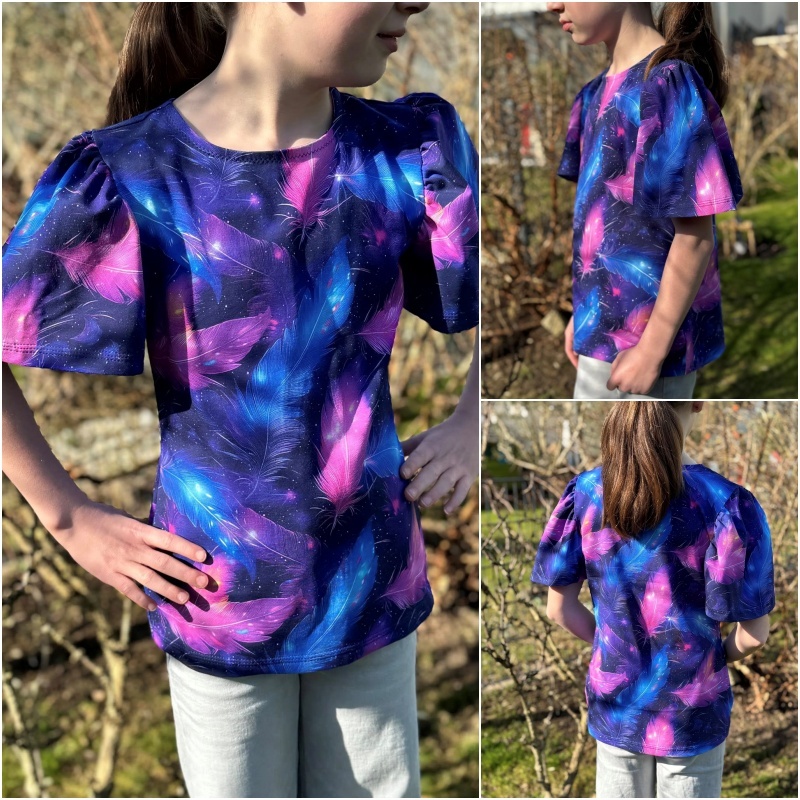 Das Schnittmuster Veilchenzart ist ein herrlich wandelbares Shirt, das einfach zu jeder Gelegenheit passt und dich durch das ganze Jahr begleitet. Trotz seiner unkomplizierten Basicform sorgen die vielen tollen Varianten dafür, dass beim Nähen nie Langeweile aufkommt und immer wieder neue Looks entstehen. Alle Versionen von Veilchenzart haben dabei zwei feste Grundbausteine gemeinsam: Du hast die Wahl zwischen einer geraden oder einer leicht taillierten Seitenführung, und der Halsausschnitt wird immer edel mit einem Beleg sowie einem praktischen Schlüssellochausschnitt am Rückteil verarbeitet. Neben diesen Grundlagen kannst du dein Shirt am unteren Abschluss ganz nach deinem Geschmack gestalten: Wähle zwischen einem klassischen Saum, einem verspielten Schleifenabschluss oder einer romantischen Abschlussrüsche. Auch bei den Ärmeln bist du für jede Jahreszeit gewappnet. Es gibt den normalen Saumärmel in kurz und lang sowie eine spezielle Schleifenergänzung, die du sowohl an kurzen als auch an langen Ärmeln umsetzen kannst. Ein besonderes Highlight sind die drei verschiedenen Flügelärmel-Varianten, die im Schnittmuster enthalten sind. Diese kannst du entweder ganz solo als sommerliche Ärmel nähen oder für einen besonderen Lagen-Look kreativ mit dem langen Ärmel kombinieren.