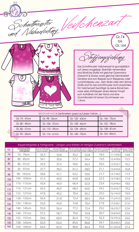 Das Schnittmuster ist in Echtgröße (du nähst hier nach echter Körpergröße) gradiert und enthält keine Naht- und Saumzugabe. Es umfasst die Größen 74 bis 164 und ist damit für eine Körpergröße zwischen 74 und 169 cm geeignet. In den Dateien findest du die A4-Versionen zum Ausdrucken, eine A0-Datei (Großdruck) sowie die Beamerdatei - alle Versionen inkl. Ebenen zum Ein- und Ausblenden der Größen. Veilchenzart ist hauptsächlich auf Jersey ausgelegt und für Fortgeschrittene und ambitionierte Anfänger geeigent.