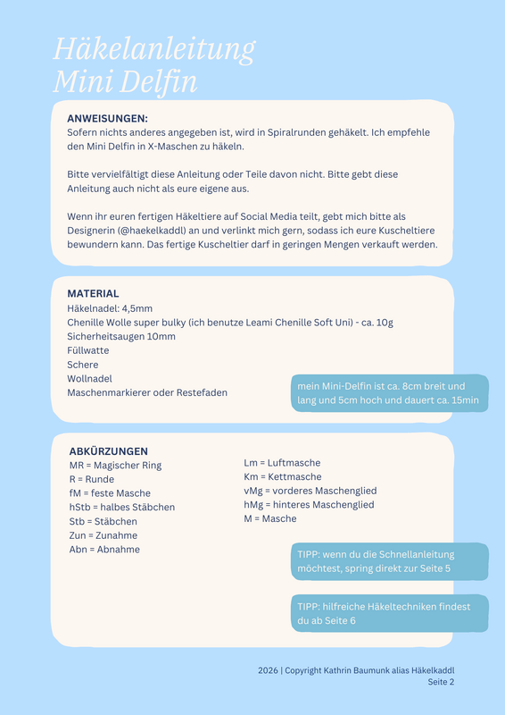 Die Anleitung darf nicht weiterverbreitet oder kommerziell vervielfältigt werden. Selbstgefertigte Mini‑Delfine dürft ihr in kleinen Stückzahlen unter Angabe meines Namens (@Häkelkaddl) verkaufen.