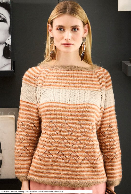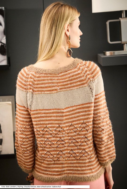 Dieser Raglan-Pullover mit Siebenachtel-Ärmeln ist perfekt für alle, die Abwechslungsreichtum lieben. Sechs Farben in zwei unterschiedlichen Qualitäten kommen hier zum Einsatz: Da ist einmal ein Garn aus reiner Baumwolle und ein zotteliges Garn aus Baumwolle mit Polyamid. Zudem bleibt es nicht allein beim Streifen-Look – ein löchriges Zackenmuster am Rumpf verleiht dem top-down gestrickten Modell einen außergewöhnlichen Charakter. Ansonsten wird glatt rechts gearbeitet und die Raglanschrägungen sind mit einem Ajourmuster betont. Ausschnittblende und Bündchen werden im Rippenmuster gestrickt. Ein Anleitung gibts für die Größen 36/38, 42/44 und 48/50.