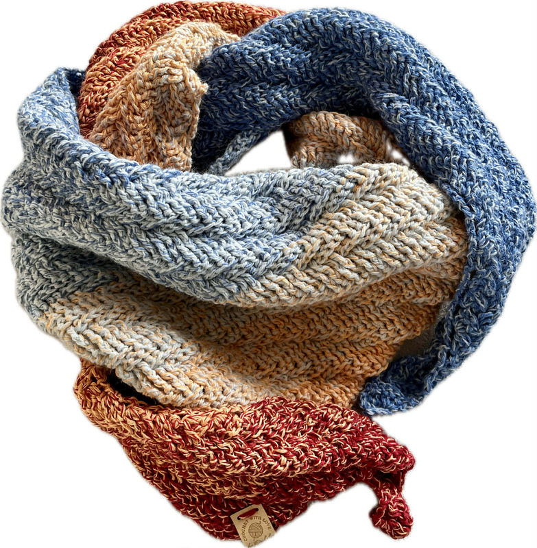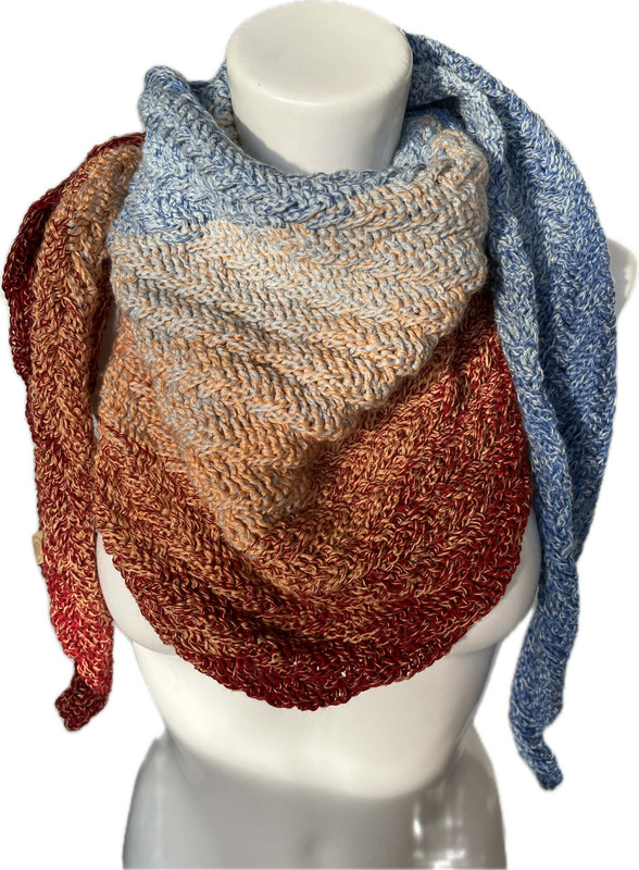 3- oder 4-fädiges Farbverlaufsgarn mit einer Lauflänge ab 1200 m. Ein Tuch in Kindergröße kommt mit einer Lauflänge von 1000 m aus.