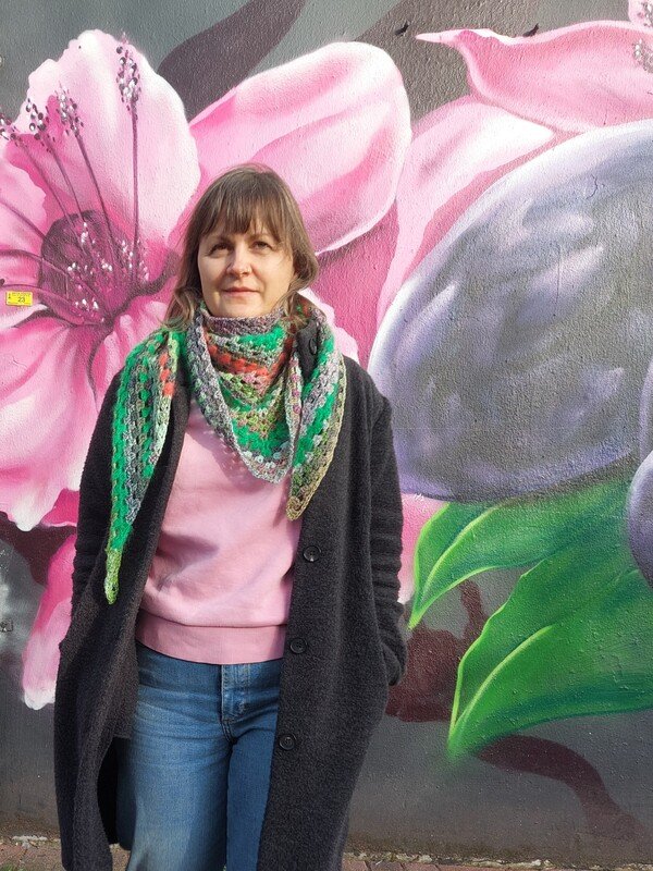Der REGRANNY shawl kann einmal um den Hals geschlungen und mit einem Knoten gebunden werden. Du kannst die Größe nach Wunsch anpassen und das Tuch mit jeder Garnstärke, Maschenprobe und passenden Nadelstärke häkeln.