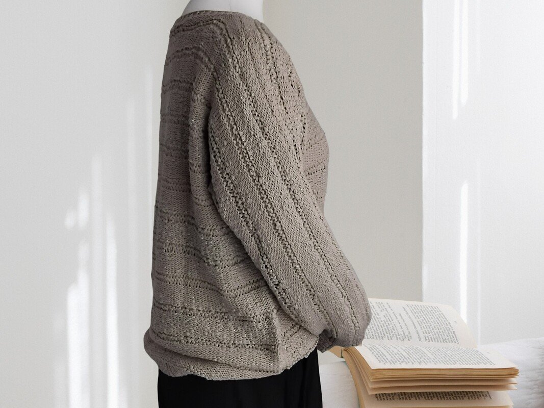 Dieser stilvoller Strickpullover verleiht mit seinem dezenten Metalliceffekt und der besonders klaren Linienführung jedem Outfit einen Touch. Der Sweater ist nicht nur ein gemütliches Alltagsstück, sondern auch ein Design-Highlight für deinen Kleiderschrank – vielseitig kombinierbar und einfach zu stricken!