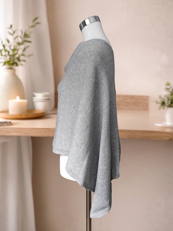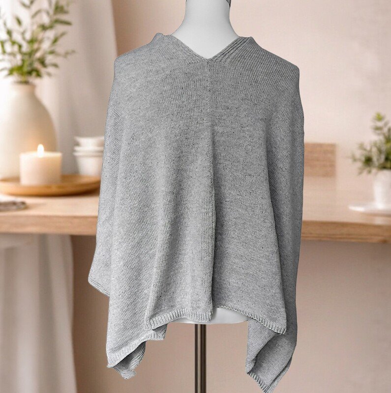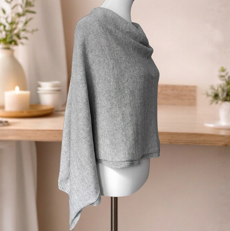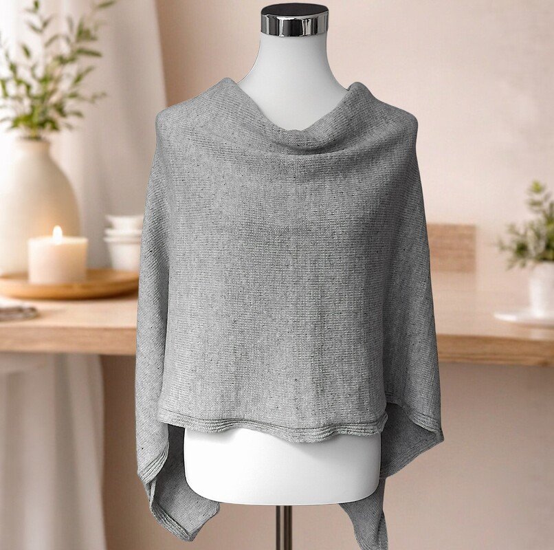 Dieser elegante Poncho ist aus luxuriösem Kaschmirgarn gefertigt und überzeugt durch seine unglaublich weiche, leichte und anschmiegsame Qualität. Dank seiner lockeren Form und dem offenen Schnitt eignet sich der Poncho perfekt als vielseitiges Layering-Teil – ob über dem Pullover an kühlen Tagen oder lässig über dem Shirt im Frühling. Die dezente graue Farbe macht ihn zum idealen Kombinationsstück für viele Outfits und Gelegenheiten.