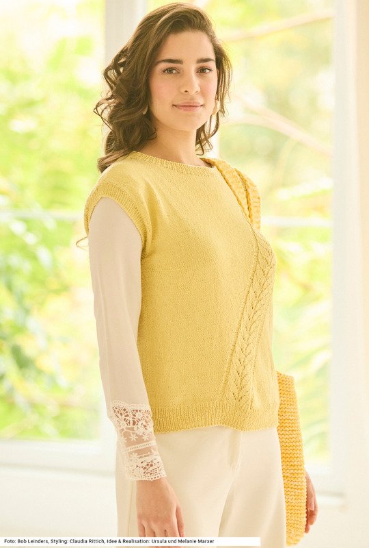 Für das Top:**- LANA GROSSA "Setapura" (100 % Seide, LL = 200 m/50 g)- 250 (250) 300 g Zartgelb **(Fb 01)