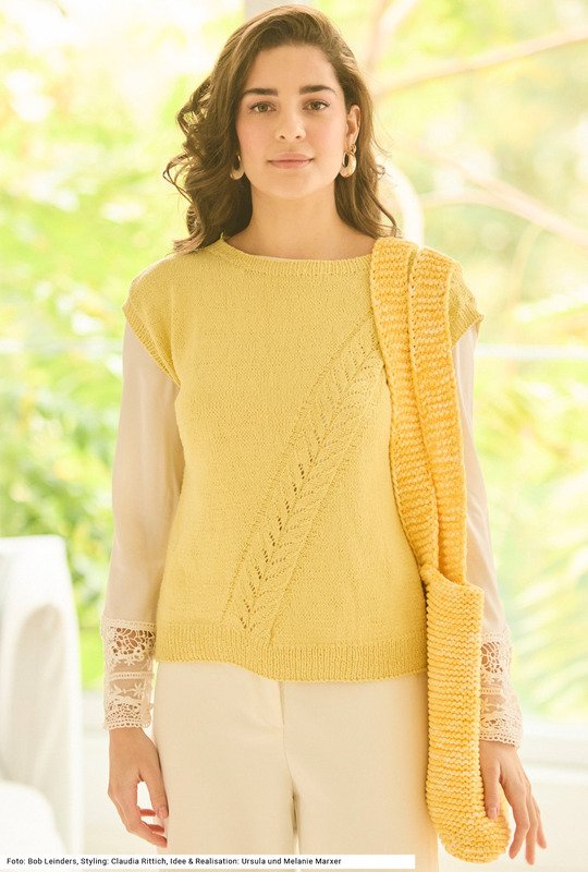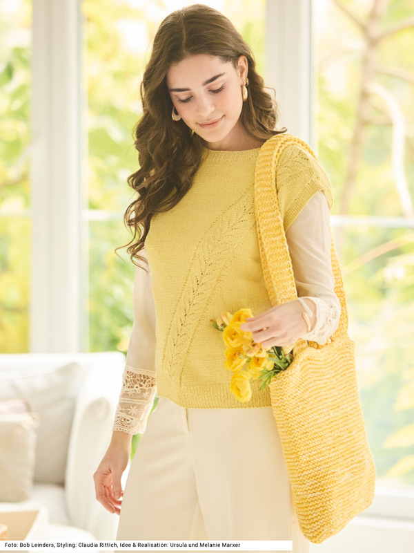 Dieses Duo zeigt, wie unterschiedliche Materialien zu einem modischen, spannenden Look kombiniert werden können. Das Top aus reiner Seide sorgt mit seinem diagonal verlaufenden Ajourstreifen im Vorderteil für elegante Leichtigkeit. Alle Bündchen und die Halsausschnittblende werden im Rippenmuster gearbeitet. Die große, kraus rechts gestrickte Tasche aus einem farblich passenden dicken Garn mit Melange-Effekt aus Baumwolle und Polyamid ergänzt den Pullunder kernig-kraftvoll – ein spannender Kontrast zwischen fein und robust. Eine Anleitung steht für die Größen 36/38, 40/42 und 44/46, Tasche: 35 cm breit, 32 cm hoch zur Verfügung.