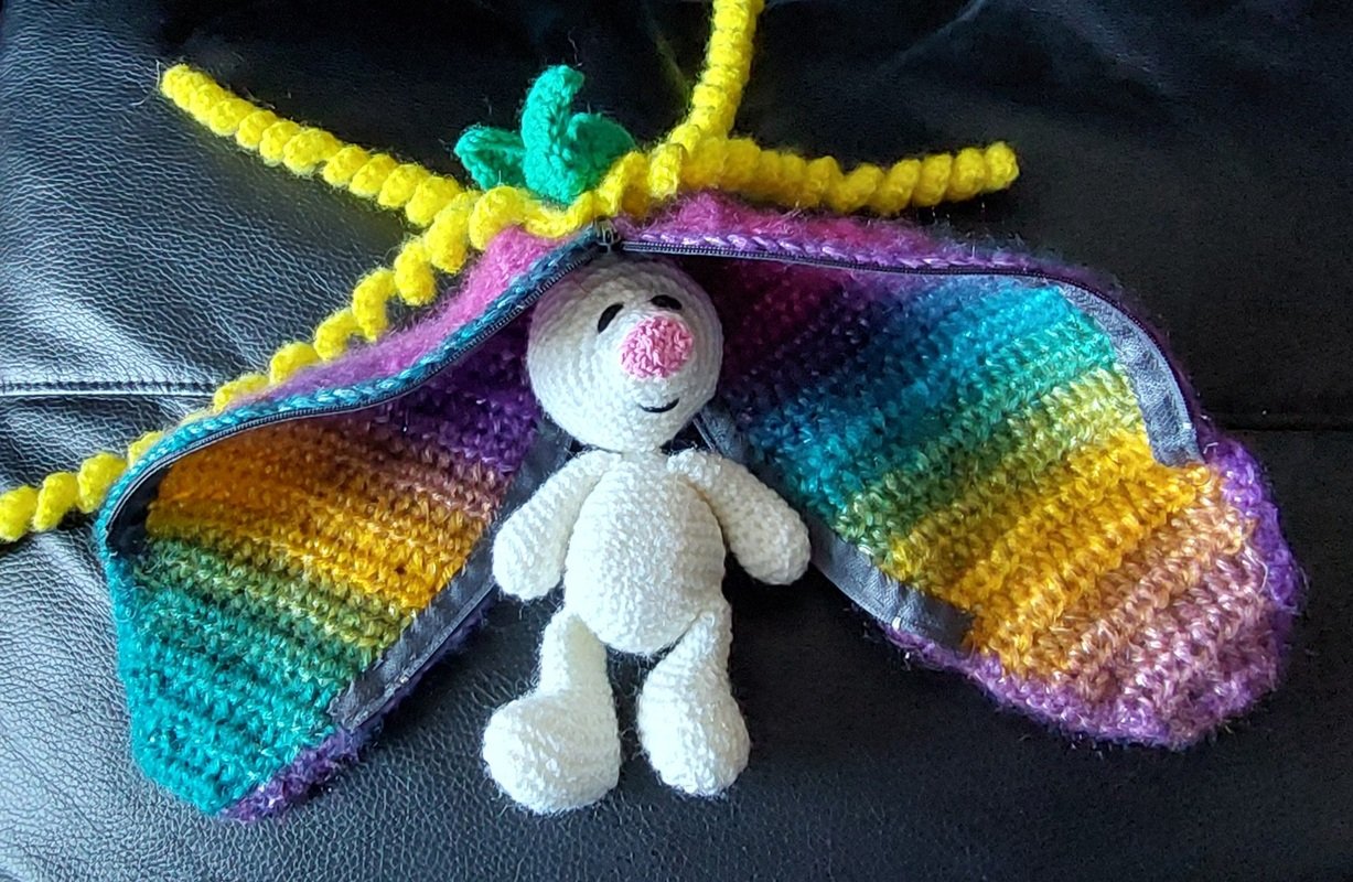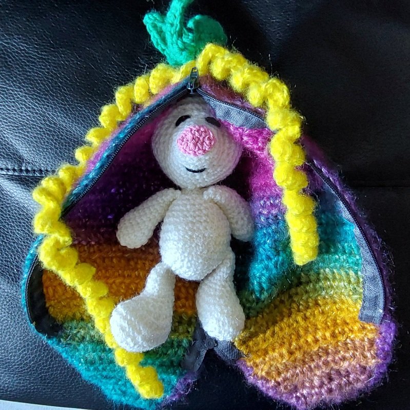 Wolle weiß oder beige, lila, gelb, grün und etwas schwarz. (mit den Farben könnt Ihr selbstverständlich variieren)