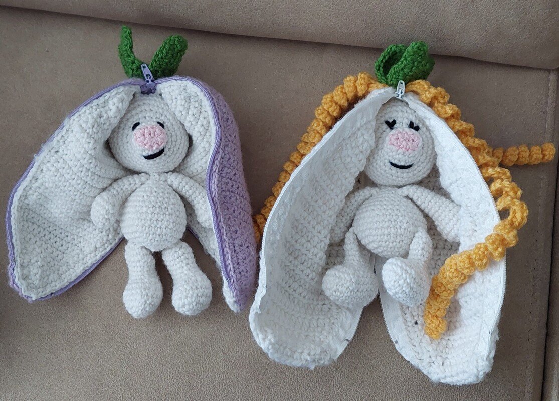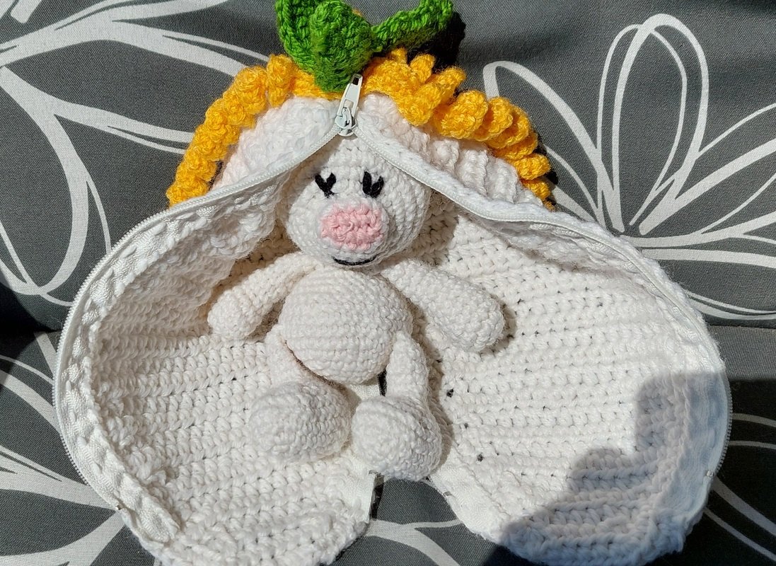 Hallo! Hier bin ich - Euer Langohrhasi. Der kleine Hase versteckt sich in seinen langen Ohren.