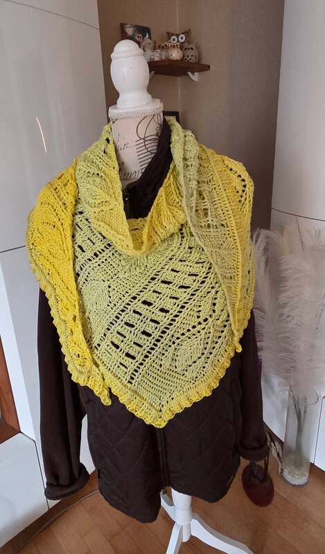 Das Tuch kann in jeder beliebigen Größe gehäkelt werden, da sich die Reihen wiederholen. Bitte beachte, wenn du eine andere Wolle verwendest, eine andere Nadelstärke, oder generelle lockerer/fester häkelst, kann die Größe variieren.