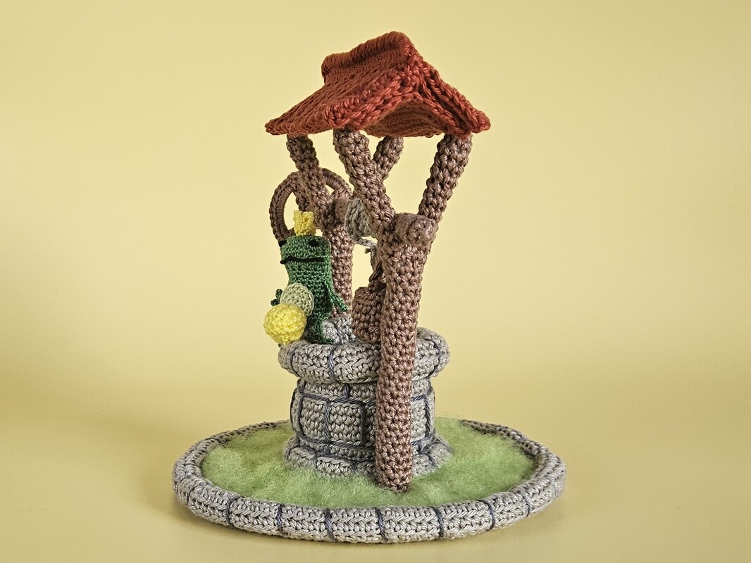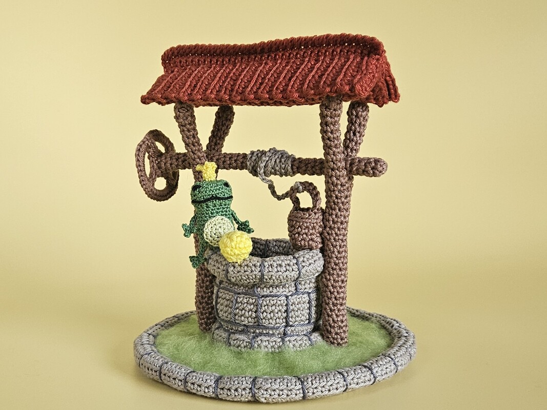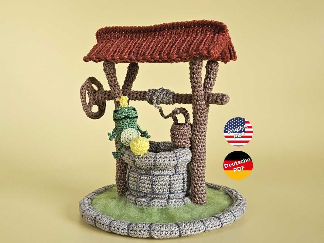 In dieser detailreichen Häkelanleitung entsteht ein liebevoll gestalteter Brunnen mit Dach, Kurbel und Eimer, in dem der kleine Frosch mit seiner goldenen Kugel sitzt. Jedes Element ist aufeinander abgestimmt und ergibt am Ende eine stimmige Szene voller Charakter.