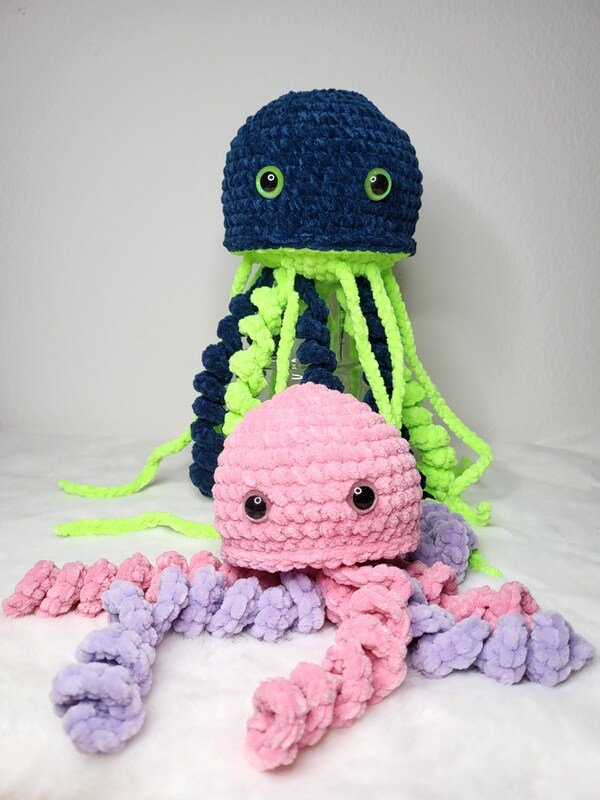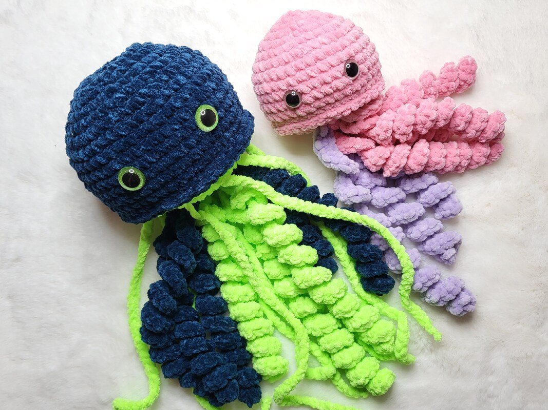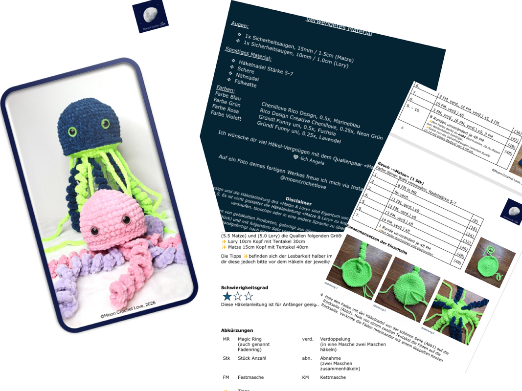 Mit «Matze & Lory», dem niedlichen Quallenpaar, bekommst du eine liebevoll und detailliert gestaltete Häkelanleitung im PDF-Format, mit der du die beiden Quallen eigenständig mit der Häkelnadel zum Leben erwecken kannst.