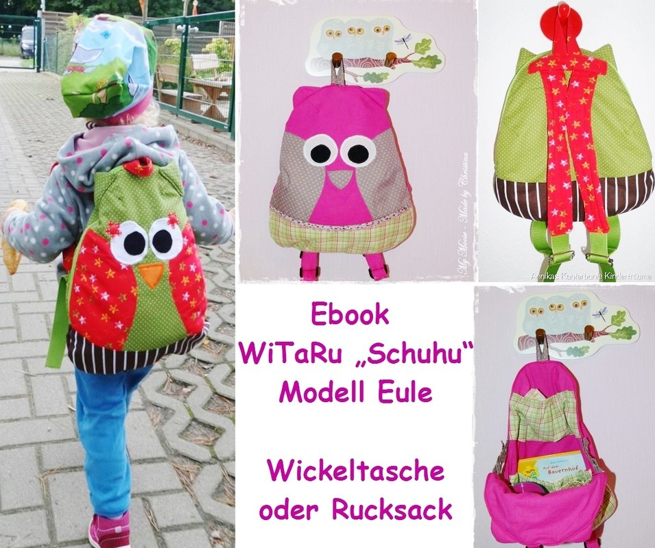 Das Ebook erklärt Schritt für Schritt in Wort und Bild auf 39 Seiten, wie die Tasche genäht wird. Dazu gibt es den achtseitigen Schnitt der WiTaRu "Schuhu".
