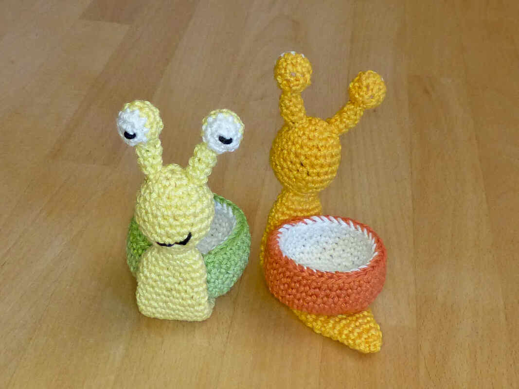 Bei Verwendung von Baumwollgarn mit einer Lauflänge von ca. 125m/50g und Nadelstärke 3 wird die Schnecke ca. 8 x 11 x 5,5 cm groß und passt für mittelgroße Eier