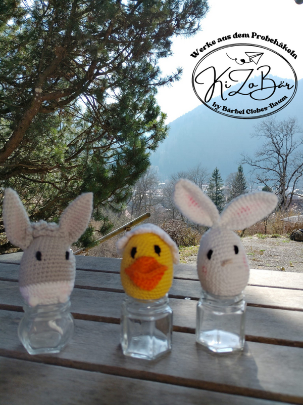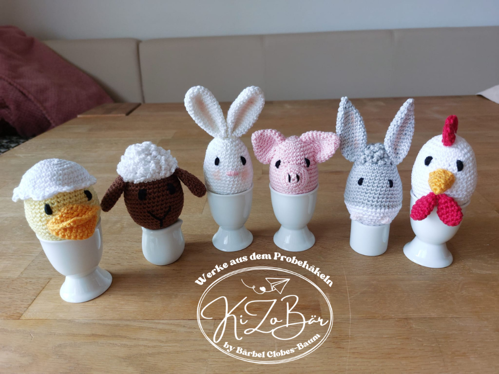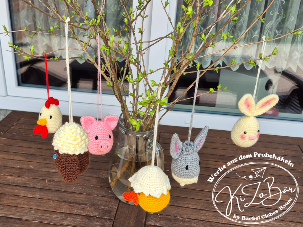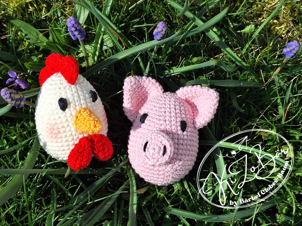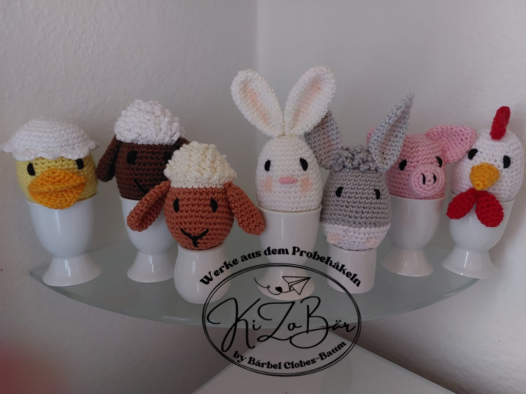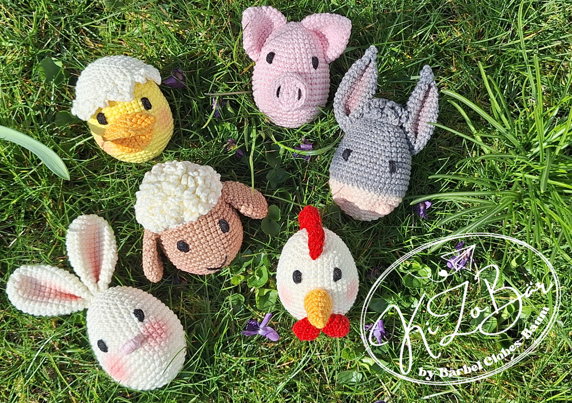 Dies ist kein fertiges Produkt, sondern eine Anleitung zum Häkeln von 6 niedlichen Bauernhoftieren (Hase, Schaf, Huhn, Entenküken, Esel, Schwein) in Eiform, die am Frühlingsstrauch oder als kleines Geschenk/Mitbringsel/Mitgebsel gut geignet sind.