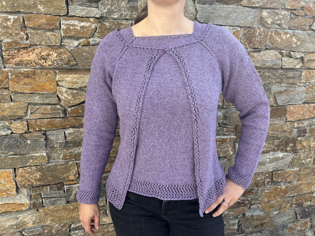 Das Design überzeugt durch klare Linien und feine Details: Dezente Lochmuster an Bündchen, Blenden und Ausschnitt schaffen eine luftige, feminine Optik und verbinden beide Modelle zu einer stilvollen Einheit. Die glatt rechts gestrickten Flächen sorgen für Ruhe im Gesamtbild und machen das Set zu einem vielseitigen Begleiter für viele Anlässe.