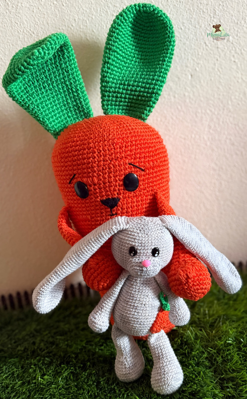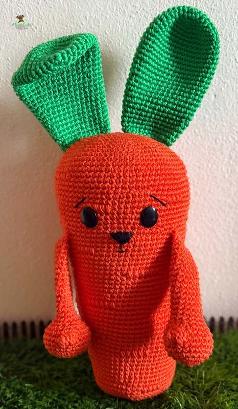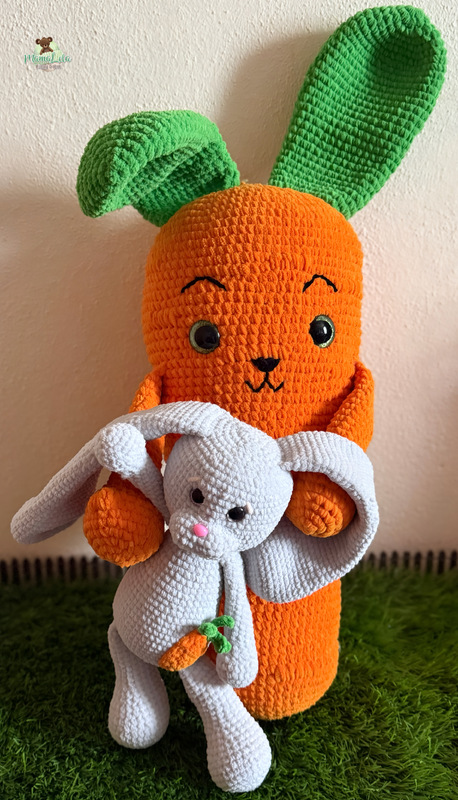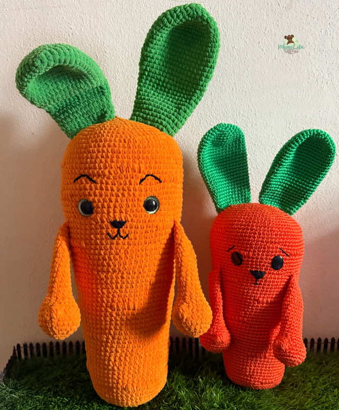 Mit den angegebenen Materialien wird Mr. Möhre in der Originalversion ca. 50 cm und sein Hasi ca. 25 cm groß. In der angegebenen Alternative wird Mr. Möhre ca. 30 cm und sein Hasi ca. 15 cm groß.
