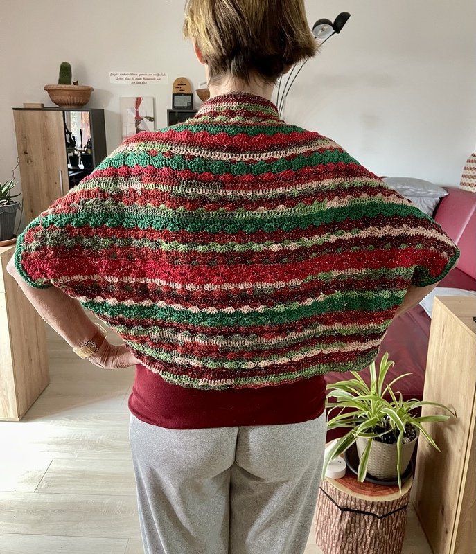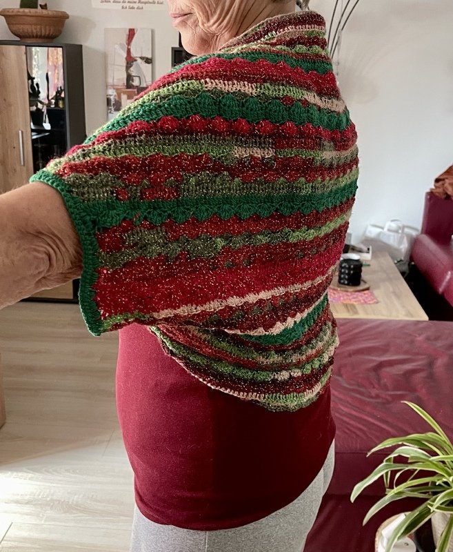 Hier habe ich einen schönen Seelenwärmer gehäkelt, der aus Restwolle (auch Sockenwolle) gemacht wurde. Er ist nicht nur für festliche Kleidung, sondern auch zu Basics wunderbar kompinierbar.